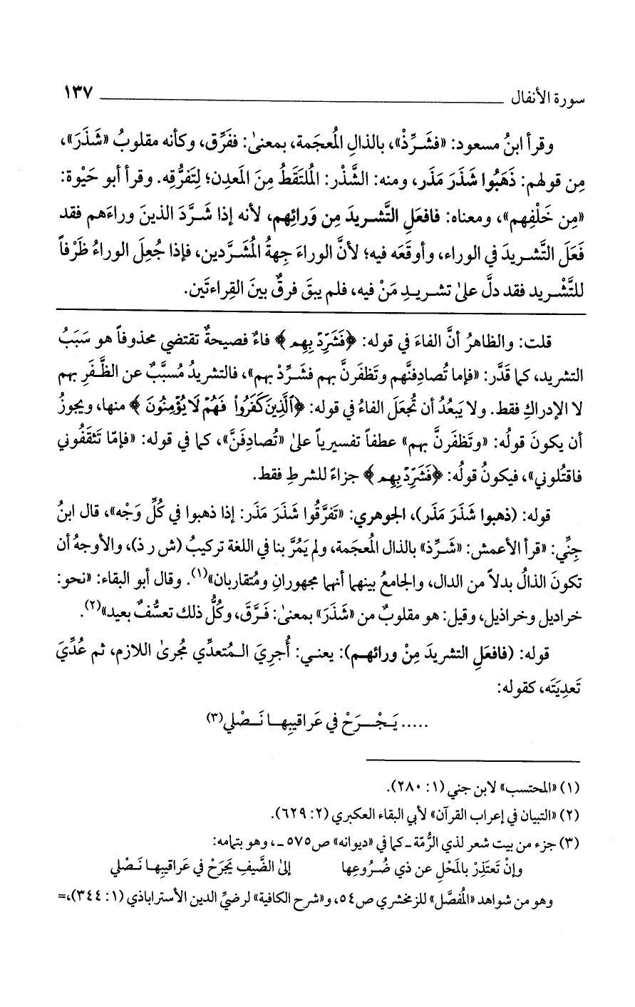 قوله: (ذهبوا شذر مذر)، الجوهري: "تفرقوا شذر مذر: إذا ذهبوا في كل وجه"، قال ابن جني: "قرأ الأعمش: "شرذ" بالذال المعجمة، ولم يمر بنا في اللغة تركيب (ش ر ذ)، والأوجه أن تكون الذال بدلاً من الدال، والجامع بينهما أنهما مجهوران ومتقاربان". وقال أبو البقاء: "نحو: خراديل وخراذيل، وقيل: هو مقلوب من "شذر" بمعنى: فرق، وكل ذلك تعسف بعيد".