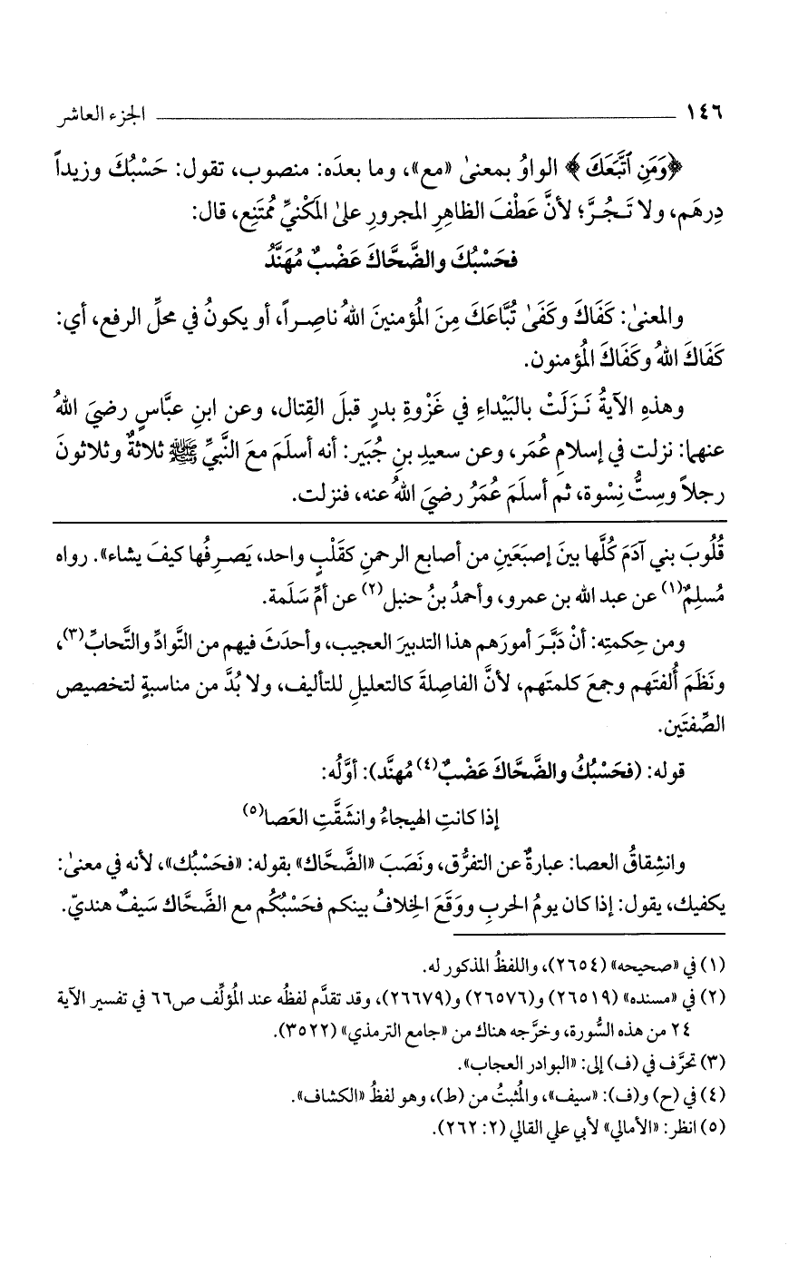 قلوب بني آدم كلها بين إصبعين من أصابع الرحمن كقلب واحد، يصرفها كيف يشاء". رواه مسلم عن عبد الله بن عمرو، وأحمد بن حنبل عن أم سلمة.