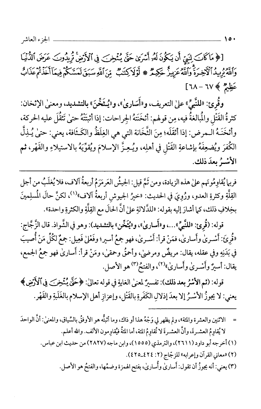 قوله: (قرئ: "للنبي" ... ، و"أسارى"، و"يُثخن" بالتشديد): وهو في الشواذ. قال الزجاج: "قرئ: أسرى وأسارى، فمن قرأ: أسرى، فهو جمع أسير؛ وفعلى فعيل: جمع لكل من أصيب في بدنه وفي عقله، يقال: مريض ومرضى، وأحمق وحمقى، ومن قرأ: أسارى فهو جمع الجمع، يقال: أسير وأسرى وأسارى"، والفتح هو الأصل.