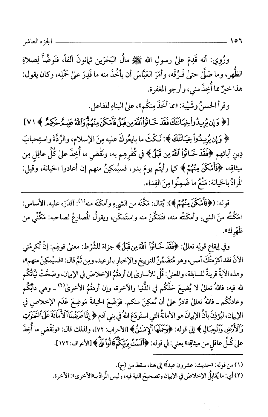 وفي إيقاع قوله تعالى: (فَقَدْ خَانُوا اللَّهَ مِنْ قَبْلُ) جزاء للشرط: معنى قولهم: إن تكرمني الآن فقد أكرمتك أمس، وهو متضمن للتوبيخ والإخبار بالوعيد، ومن ثم قال: "فسيمكن منهم"، وهذه الآية قرينة للسابقة، والمعنى: قل للأسارى إن أردتم الإخلاص في الإيمان، وصحت نياتكم لله فيه، فالله تعالى لا يضيع حقكم في الدنيا والآخرة، وإن أردتم الأخرى - وهي دأبكم وعادتكم - فالله تعالى قادر على أن يمكن منكم. فوضع الخيانة موضع عدم الإخلاص في الإيمان، ليؤذن بأن الإيمان هو الأمانة التي استودع الله في بني آدم (إِنَّا عَرَضْنَا الأَمَانَةَ عَلَى السَّمَوَاتِ وَالأَرْضِ وَالْجِبَالِ) إلى قوله: (وَحَمَلَهَا الإِنْسَانُ) [الأحزاب: 72]، ولذلك قال: "ونقض ما أُخذ على كل عاقل من ميثاقه" يعني: في قوله: (أَلَسْتُ بِرَبِّكُمْ قَالُوا بَلَى) [الأعراف: 172].