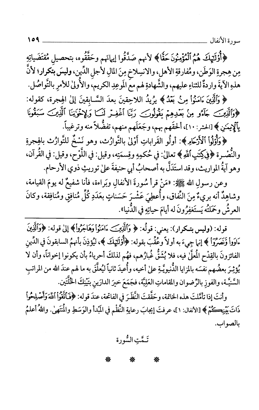 وأنت إذا تأملت هذه الخاتمة، حققت النظر في الفاتحة، عند قوله: (فَاتَّقُوا اللَّهَ وَأَصْلِحُوا ذَاتَ بَيْنِكُمْ) [الأنفال: 1]، عرفت إيجاب رعاية النظم في المبدأ والوسط والمنتهى. والله أعلم بالصواب.