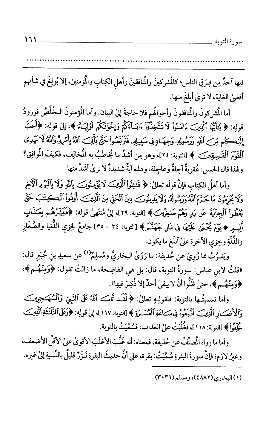 ويقرب مما رُوي عن حذيفة: ما روى البخاري ومسلم عن سعيد بن جبير قال: "قلت لابن عباس: سورة التوبة، قال: بل هي الفاضحة، ما زالت تقول: (وَمِنْهُمْ)، (وَمِنْهُمْ)، حتى ظنوا أن لا يبقى أحدٌ إلا ذُكر فيها".