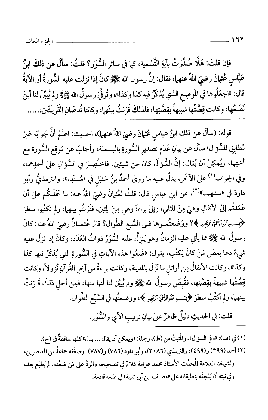 قوله: (سأل عن ذلك ابن عباس عثمان رضي الله عنهما)، الحديث: اعلم أن جوابه غير مطابق للسؤال؛ سأل عن بيان عدم تصدير السورة بالبسملة، وأجاب عن موقع السورة مع أختها، ويمكن أن يُقال: إن السؤال كان عن شيئين، فاختصر في السؤال على أحدهما، وفي الجواب على الآخر، يدل عليه ما روى أحمد بن حنبل في "مسنده"، والترمذي وأبو داود في "سننهما"، عن ابن عباس قال: قلت لعُثمان رضي الله عنه: ما حملكم على أن عمدتم إلى الأنفال وهي من المثاني، وإلى براءة وهي من المثين، فقرنتم بينهما، ولم تكتبوا سطر (بسم الله الرحمن الرحيم)؟ ووضعتموها في السبع الطوال؟ قال عثمان رضي الله عنه: كان رسول الله صلى الله عليه وسلم مما يأتي عليه الزمان وهو ينزل عليه السور ذوات العدد، وكان إذا نزل عليه شيء دعا بعض من كان يكتب، يقول: "ضعوا هذه الآيات في السورة التي يُذكر فيها كذا وكذا"، وكانت الأنفال من أوائل ما نزل بالمدينة، وكانت براءة من آخر القرآن نزولاً، وكانت قصتها شبيهة بقصتها، فقبض رسول الله صلى الله عليه وسلم ولم يُبين لنا أنها منها، فمن أجل ذلك قرنت بينهما، ولم أكتب سطر (بسم الله الرحمن الرحيم)، ووضعتها في السبع الطوال.