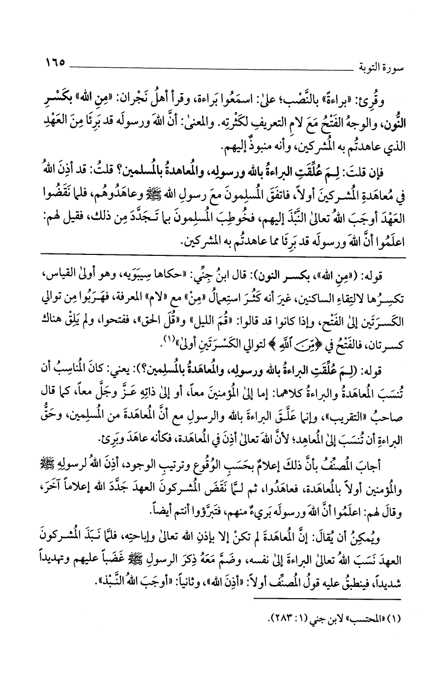 قوله: (لم عُلقت البراءة بالله ورسوله، والمعاهدة بالمسلمين؟ ): يعني: كان المناسب أن تُنسب المعاهدة والبراءة كلاهما: إما إلى المؤمنين معاً، أو إلى ذاته عز وجل معاً، كما قال صاحب "التقريب"، وإنما علق البراءة بالله والرسول مع أن المعاهدة من المسلمين، وحق البراءة أن تُنسب إلى المعاهد؛ لأن الله تعالى أذن في المعاهدة، فكأنه عاهد وبرئ.