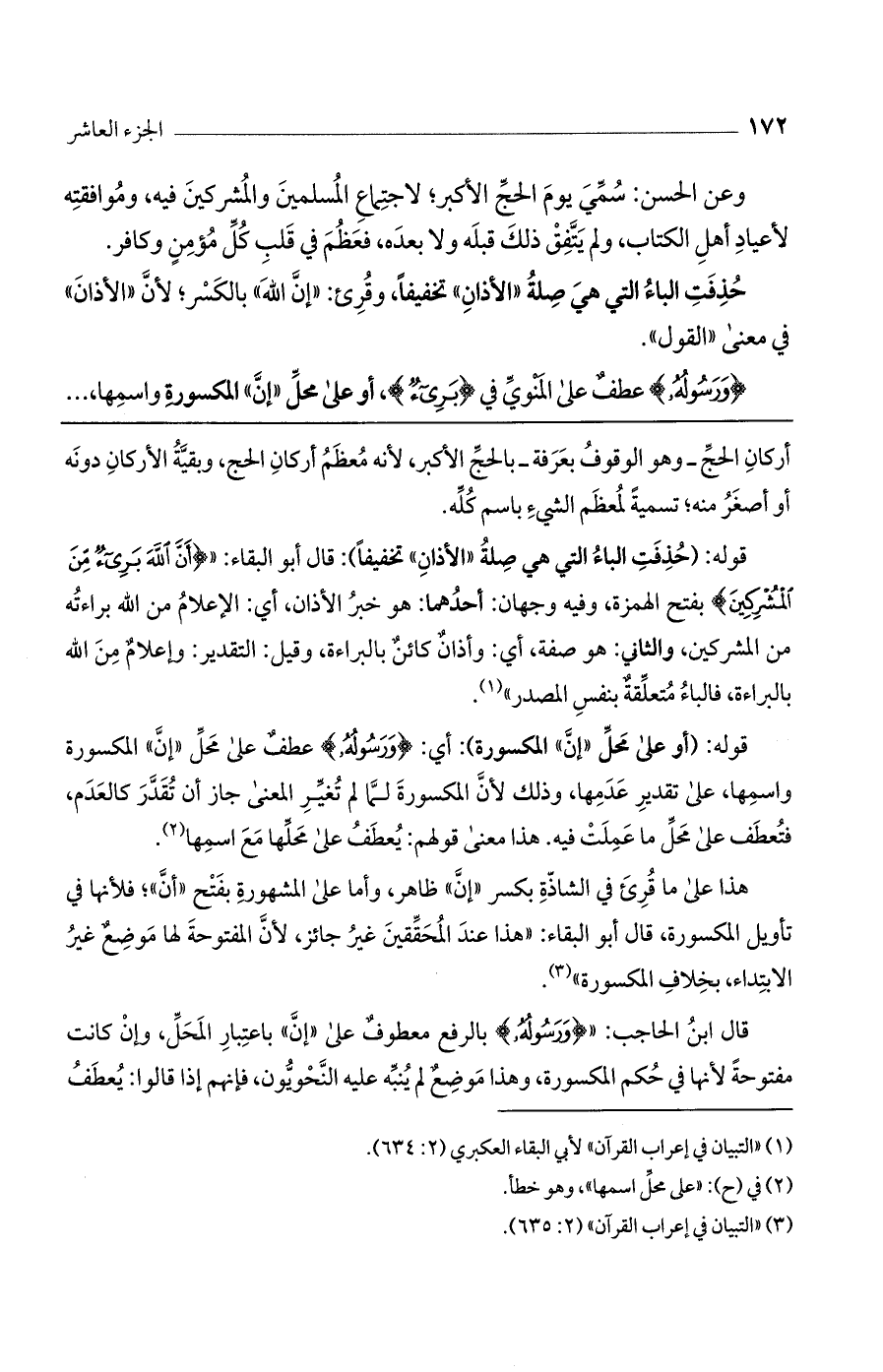 قوله: (حُذفت الباء التي هي صلة "الأذان" تخفيفاً): قال أبو البقاء: " (أَنَّ اللَّهَ بَرِيءٌ مِنْ الْمُشْرِكِينَ) بفتح الهمزة، وفيه وجهان: أحدهما: هو خبر الأذان، أي: الإعلام من الله براءته من المشركين، والثاني: هو صفة، أي: وأذان كائن بالبراءة، وقيل: التقدير: وإعلام من الله بالبراءة، فالباء متعلقة بنفس المصدر".