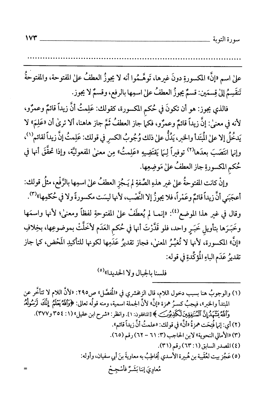 وقال في غير هذا الموضع: "إنما لم يعطف على المفتوحة لفظاً ومعنى؛ لأنها واسمها وخبرها بتأويل خبر واحد، فلو قدرت أنها في حكم العدم لأخلت بموضوعها، بخلاف "إن" المكسورة، لأنها لا تُغير المعنى، فجاز تقدير عدمها لكونها للتأكيد المحض، كما جاز تقدير عدم الباء المؤكدة في قوله: