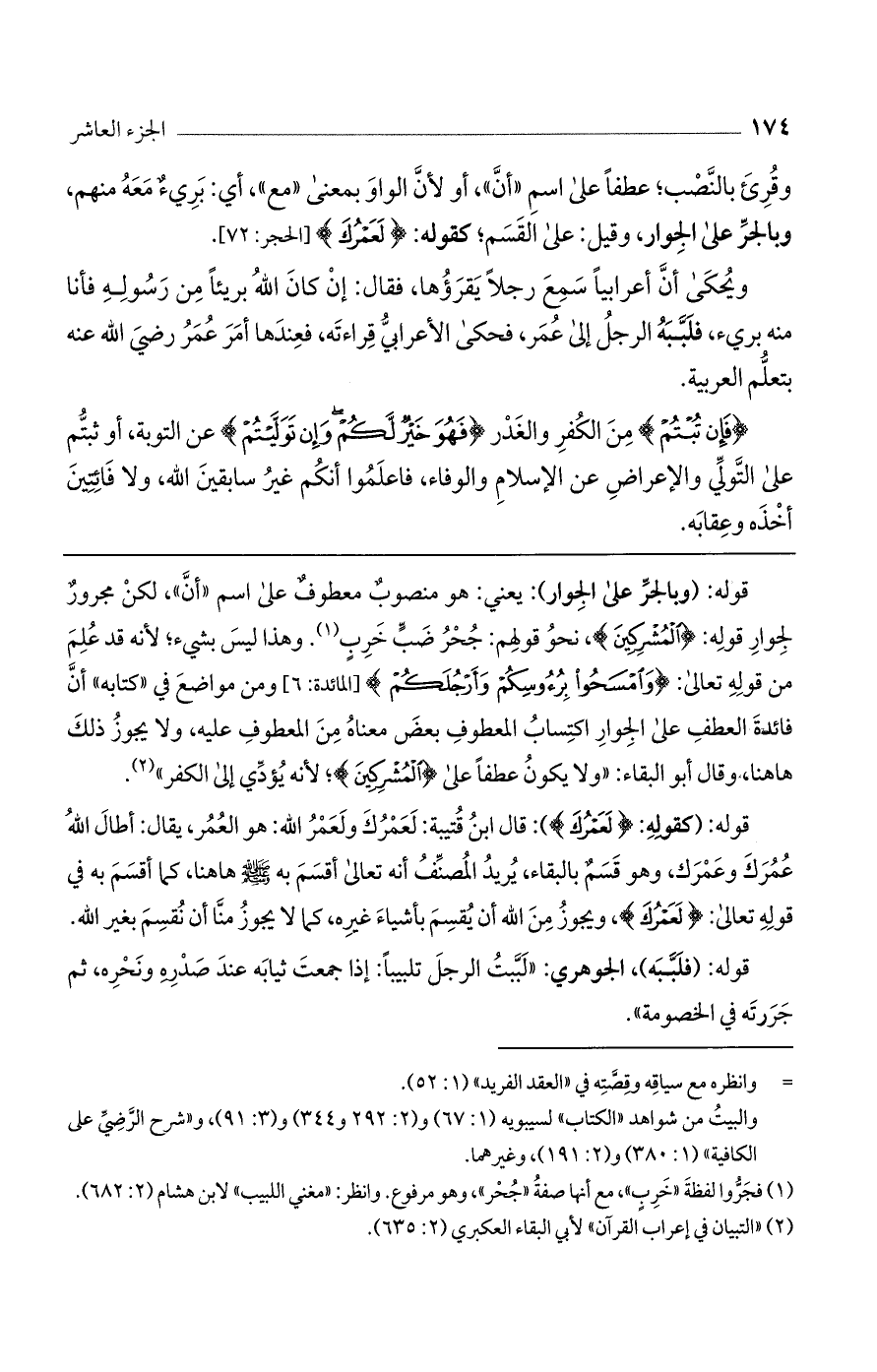 قوله: (وبالجر على الجوار): يعني: هو منصوب معطوف على اسم "أنَّ"، لكن مجرور لجوار قوله: (الْمُشْرِكِينَ)، نحو قولهم: جُحر ضب خرب. وهذا ليس بشيء؛ لأنه قد عُلم من قوله تعالى: (وَامْسَحُوا بِرُءُوسِكُمْ وَأَرْجُلَكُمْ) [المائدة: 6] ومن مواضع في "كتابه" أن فائدة العطف على الجوار اكتساب المعطوف بعض معناه من المعطوف عليه، ولا يجوز ذلك هاهنا، وقال أبو البقاء: "ولا يكون عطفا ًعلى (الْمُشْرِكِينَ)؛ لأنه يؤدي إلى الكفر".