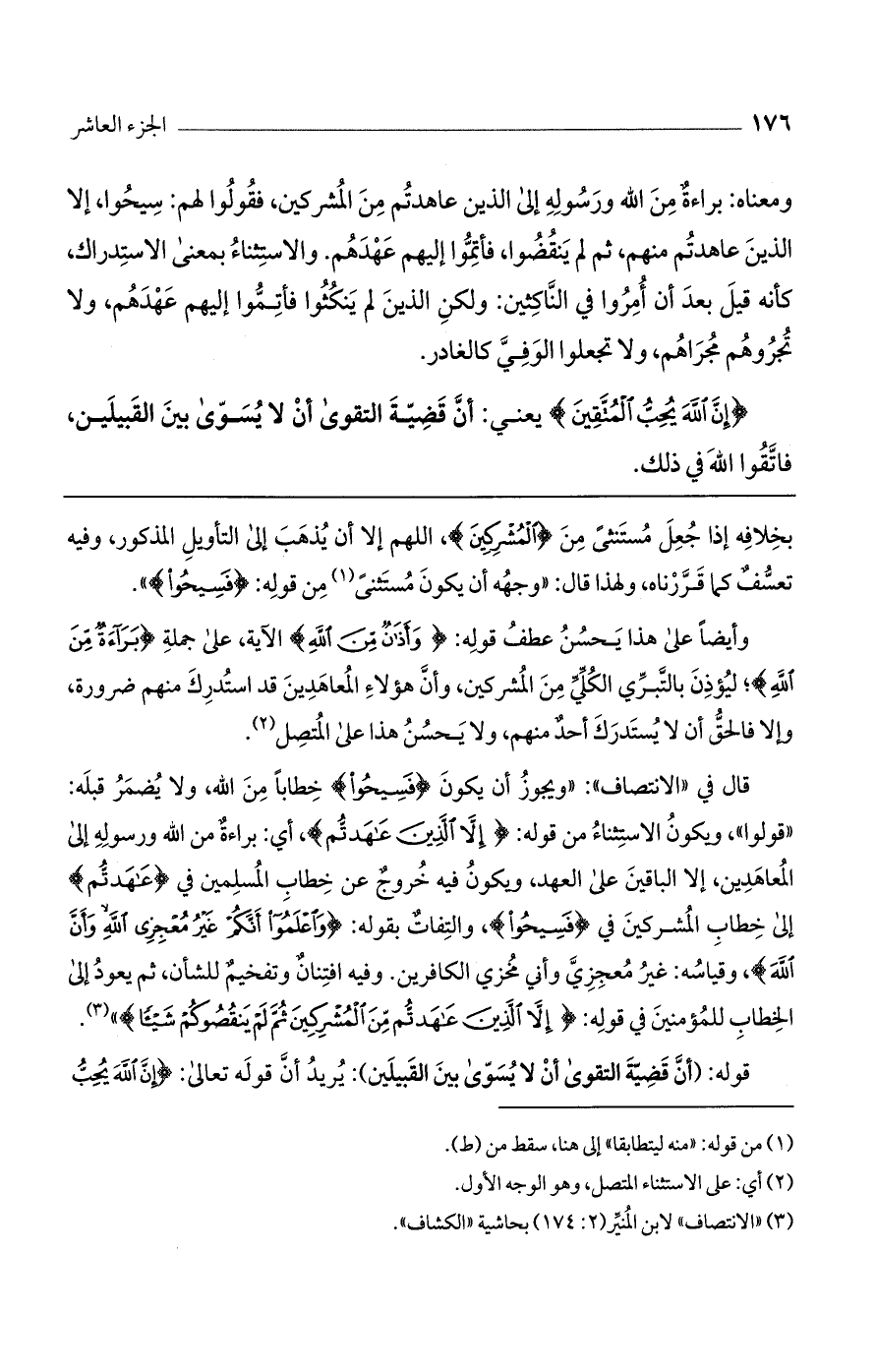 قال في "الانتصاف": "ويجوز أن يكون (فَسِيحُوا) خطاباً من الله، ولا يُضمر قبله: "قولوا"، ويكون الاستثناء من قوله: (إِلاَّ الَّذِينَ عَاهَدْتُمْ)، أي: براءة من الله ورسوله إلى المعاهدين، إلا الباقين على العهد، ويكون فيه خروج عن خطاب المسلمين في (عَاهَدْتُمْ) إلى خطاب المشركين في (فَسِيحُوا)، والتفات بقوله: (وَاعْلَمُوا أَنَّكُمْ غَيْرُ مُعْجِزِي اللَّهِ وَأَنَّ اللَّهَ)، وقياسه: غير معجزي وأني مخزي الكافرين. وفيه افتنان وتفخيم للشأن، ثم يعود إلى الخطاب للمؤمنين في قوله: (إِلاَّ الَّذِينَ عَاهَدتُّمْ مِنْ الْمُشْرِكِينَ ثُمَّ لَمْ يَنقُصُوكُمْ شَيْئاً) ".