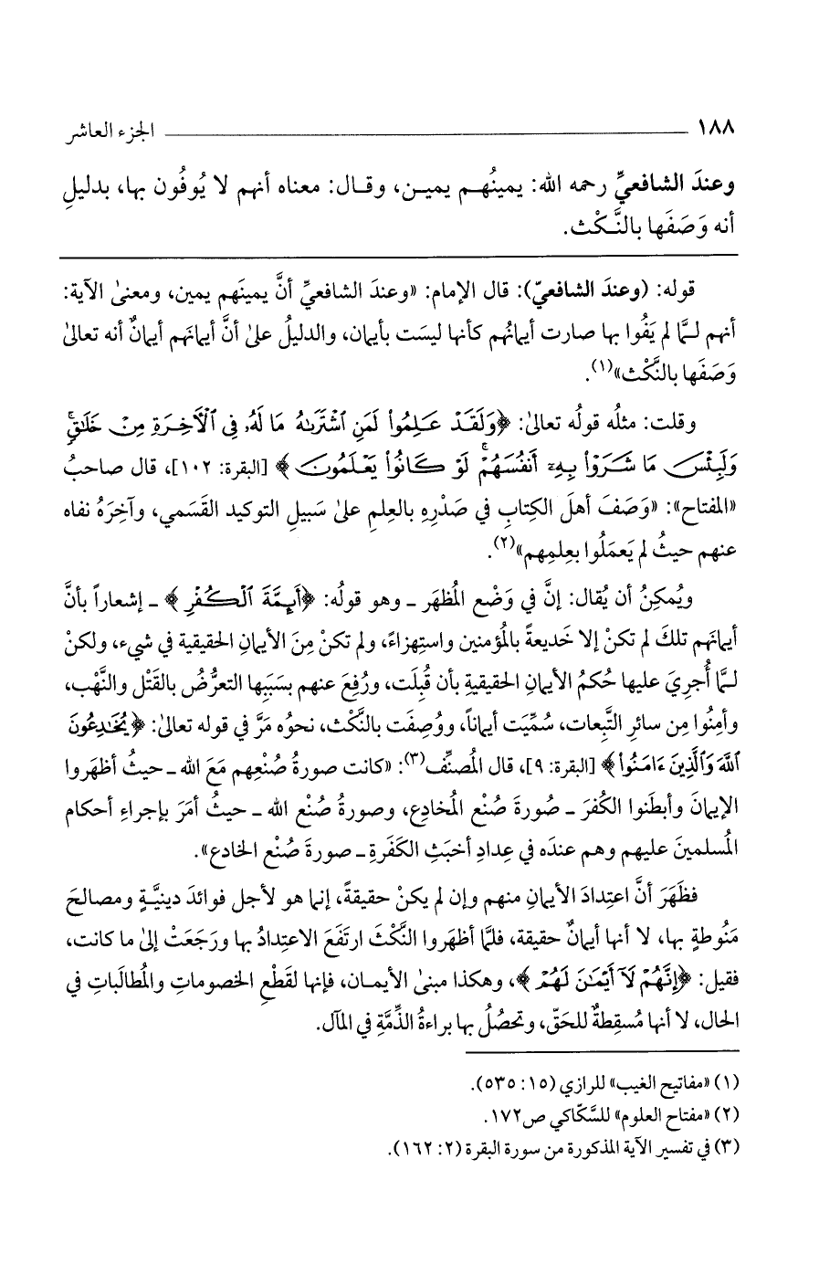 قوله: (وعند الشافعي): قال الإمام: "وعند الشافعي أن يمينهم يمين، ومعنى الآية: أنهم لما لم يفوا بها صارت أيمانهم كأنها ليست بأيمان، والدليل على أن أيمانهم أيمان أنه تعالى وصفها بالنكث".