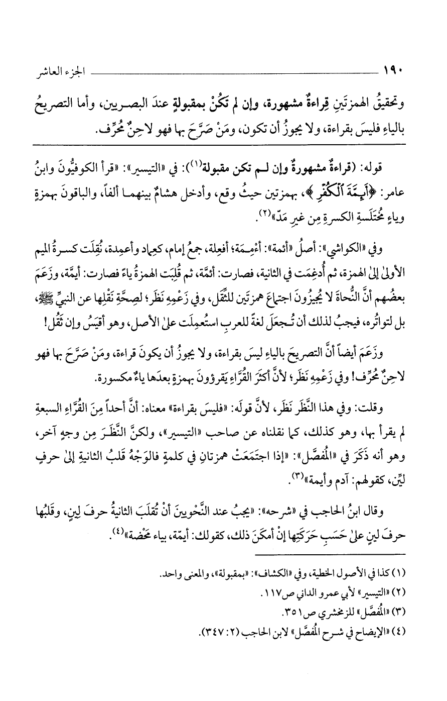 وزعم أيضاً أن التصريح بالياء ليس بقراءة، ولا يجوز أن يكون قراءة، ومن صرح بها فهو لاحن محرف! وفي زعمه نظر؛ لأن أكثر القراء يقرؤون بهمزة بعدها ياء مكسورة.