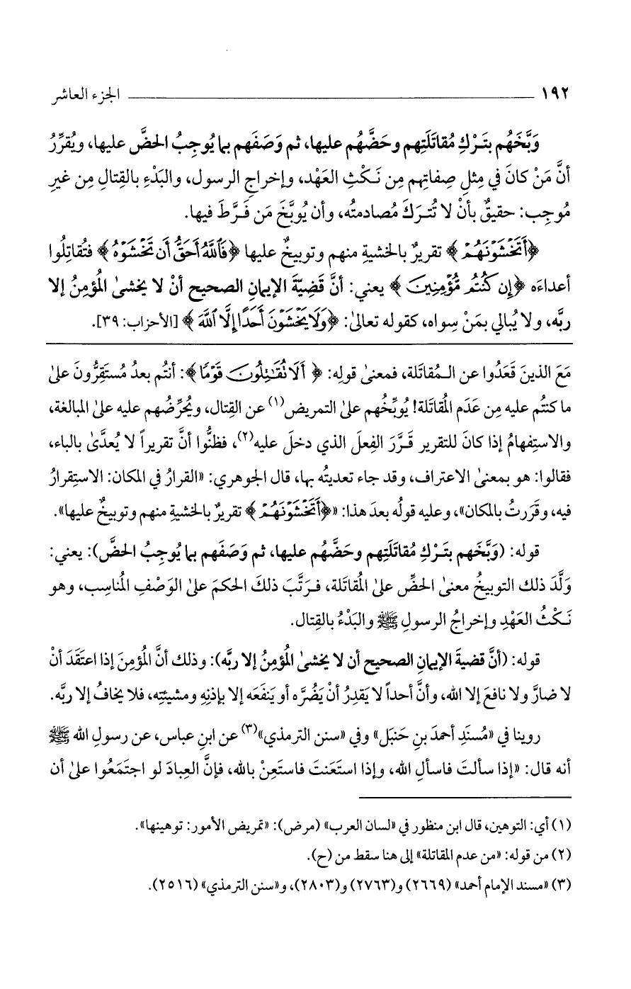 مع الذين قعدوا عن المقاتلة، فمعنى قوله: (أَلا تُقَاتِلُونَ قَوْماً): أنتم بعد مستقرون على ما كنتم عليه من عدم المقاتلة! يوبخهم على التمريض عن القتال، ويحرضهم عليه على المبالغة، والاستفهام إذا كان للتقرير قرر الفعل الذي دخل عليه، فظنوا أن تقريراً لا يُعدى بالباء، فقالوا: هو بمعنى الاعتراف، وقد جاء تعديته بها، قال الجوهري: "القرار في المكان: الاستقرار فيه، وقررت بالمكان"، وعليه قوله بعد هذا: " (أَتَخْشَوْنَهُمْ) تقرير بالخشية منهم وتوبيخ عليها".