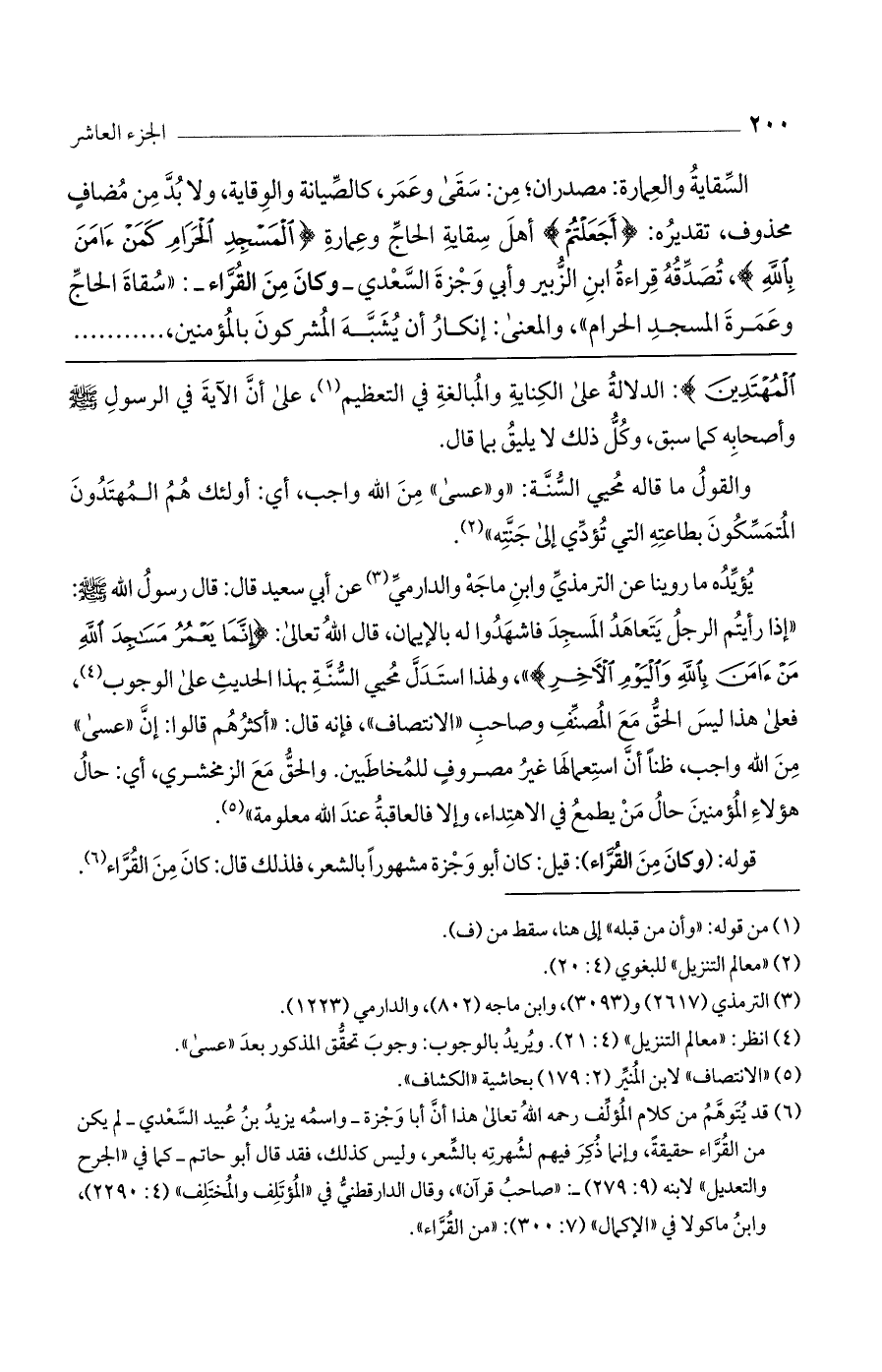 السقاية والعمارة: مصدران؛ من سقى وعمر، كالصيانة والوقاية، ولا بُد من مضاف محذوف، تقديره: (أَجَعَلْتُمْ) أهل سِقايَةَ الْحاجِّ وَعِمارَةَ (الْمَسْجِدِ الْحَرامِ كَمَنْ آمَنَ بِاللَّهِ)، وتصدقه قراءة ابن الزبير وأبى وجزة السعدي -وكان من القراء-: "سقاة الحاج وعمرة المسجد الحرام"، والمعنى إنكار أن يشبه المشركون بالمؤمنين،