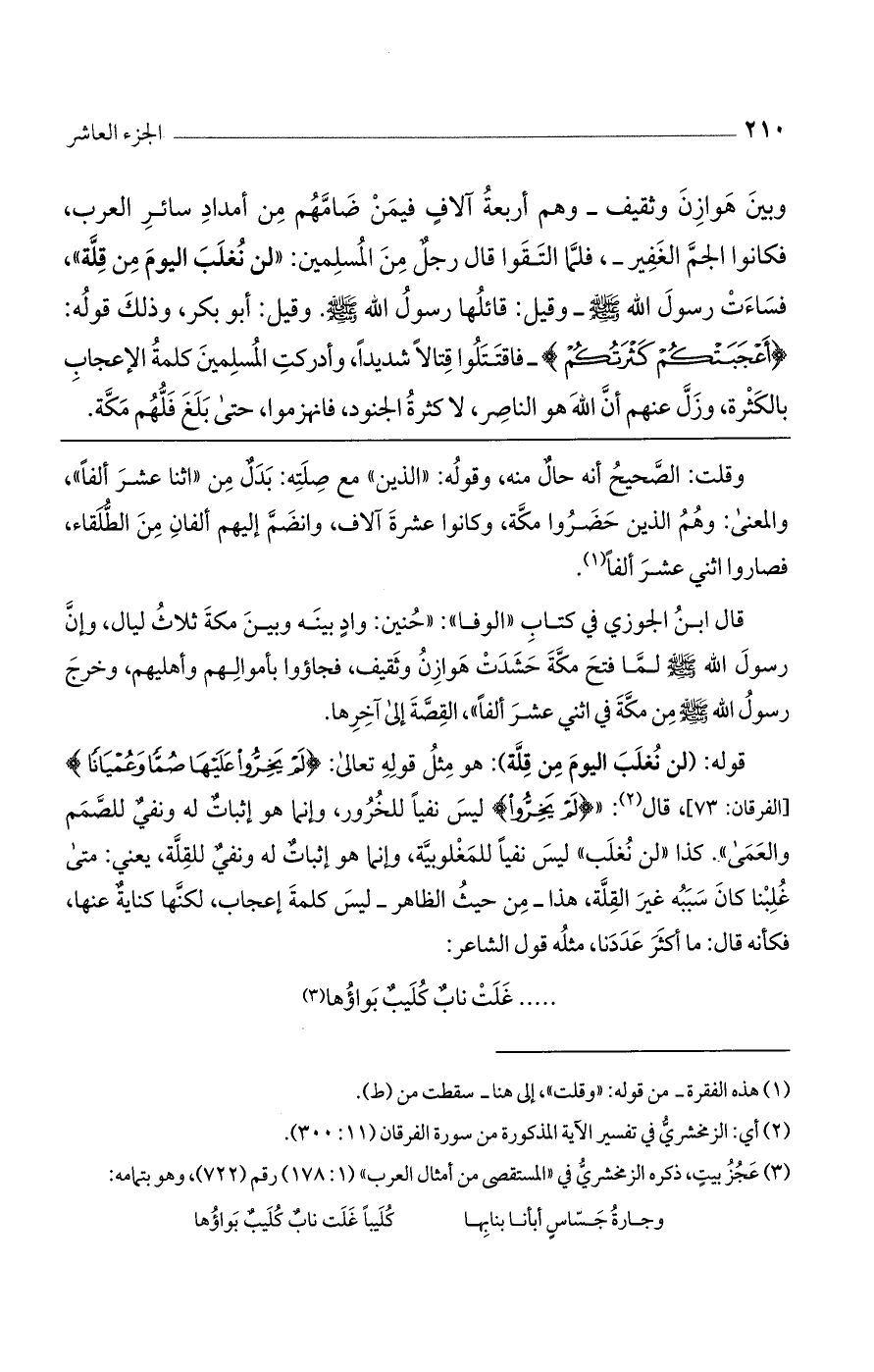 قوله: (لن نُغلب اليوم من قلة): هو مثل قوله تعالى: (لَمْ يَخِرُّوا عَلَيْهَا صُمّاً وَعُمْيَاناً) [الفرقان: 73]، قال: (لَمْ يَخِرُّوا) ليس نفياً للخرور، وإنما هو إثبات له ونفي للصمم والعمى". كذا "لن نُغلب" ليس نفياً للمغلوبية، وإنما هو إثبات له ونفي للقلة، يعني: متى غُلبنا كان سببه غير القلة، هذا - من حيث الظاهر - ليس كلمة إعجاب، لكنها كناية عنها، فكأنه قال: ما أكثر عددنا، مثله قول الشاعر: