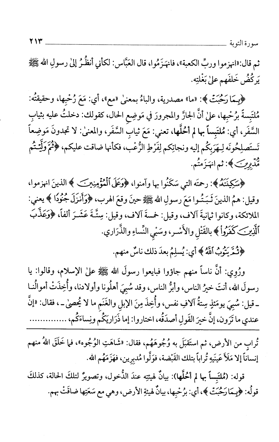 (بِما رَحُبَتْ): "ما" مصدرية، والباء بمعنى "مع"، أي: مع رحبها، وحقيقته: ملتبسة برحبها، على أنّ الجارّ والمجرور في موضع الحال، كقولك: دخلت عليه بثياب السفر، أي ملتبسا بها لم أحلها، تعنى: مع ثياب السفر، والمعنى: لا تجدون موضعًا تستصلحونه لهربكم إليه ونجاتكم لفرط الرعب، فكأنها ضاقت عليكم، (ثُمَّ وَلَّيْتُمْ مُدْبِرِينَ): ثم انهزمتم.