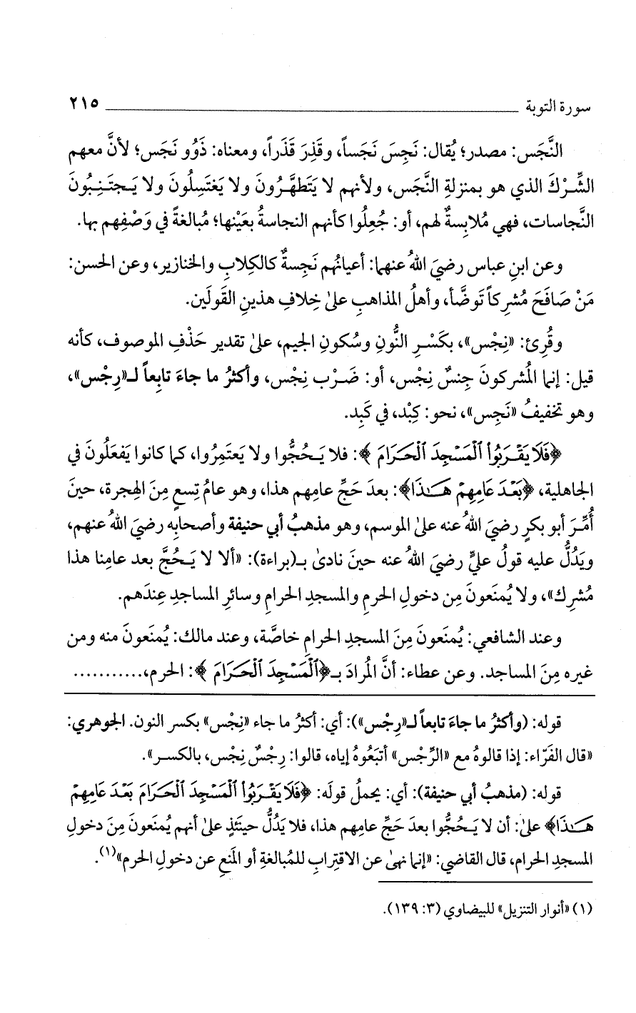 النجس: مصدر، يقال: نجس نجساً، وقذر قذراً، ومعناه: ذو ونجس؛ لأنّ معهم الشرك الذي هو بمنزلة النجس، ولأنهم لا يتطهرون ولا يغتسلون ولا يجتنبون النجاسات، فهي ملابسة لهم، أو: جعلوا كأنهم النجاسة بعينها؛ مبالغة في وصفهم بها.