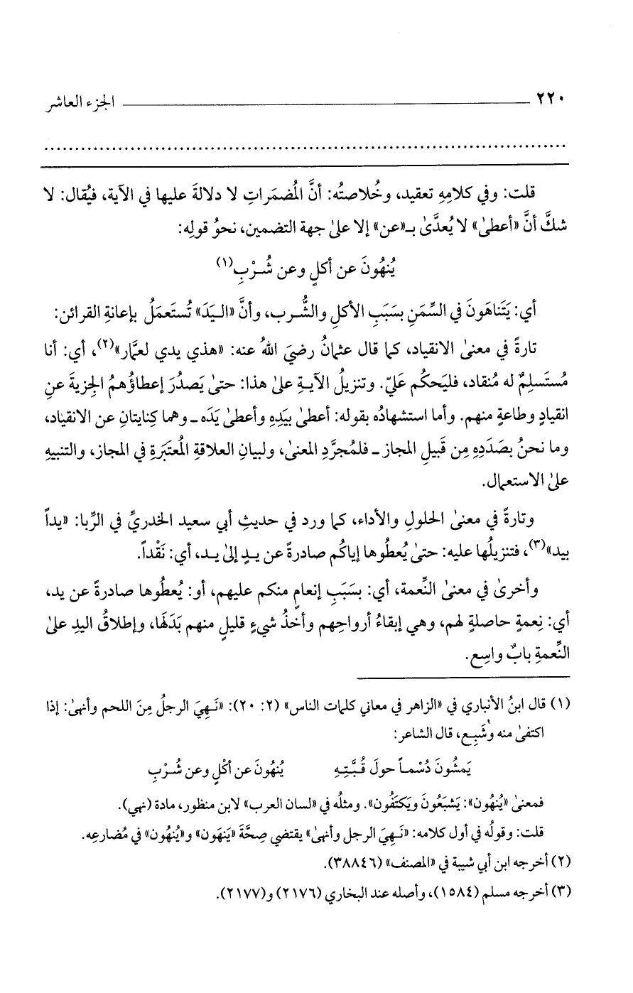 أي: يتناهون في السمن بسبب الأكل والشرب، وأن "اليد" تستعمل بإعانة القرائن: تارة في معنى الانقياد، كما قال عثمان رضي الله عنه: "هذي يدي لعمار"، أي: أنا مستسلم له منقاد، فليحكم علي. وتنزيل الآية على هذا: حتى يصدر إعطاؤهم الجزية عن انقياد وطاعة منهم. وأما استشهاده بقوله: أعطي بيده وأعطى يده - وهما كنايتان عن الانقياد، وما نحن بصدده من قبيل المجاز - فلمجرد المعنى، ولبيان العلاقة المعتبرة في المجاز، والتنبيه على الاستعمال.