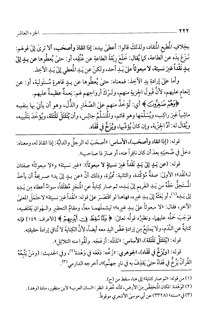 وأما على إرادة يد الآخذ: فمعناه: حتى يعطوها عن يد قاهرة مستولية، أو: عن إنعام عليهم، لأن قبول الجزية منهم، وترك أرواحهم لهم: نعمة عظيمة عليهم.
