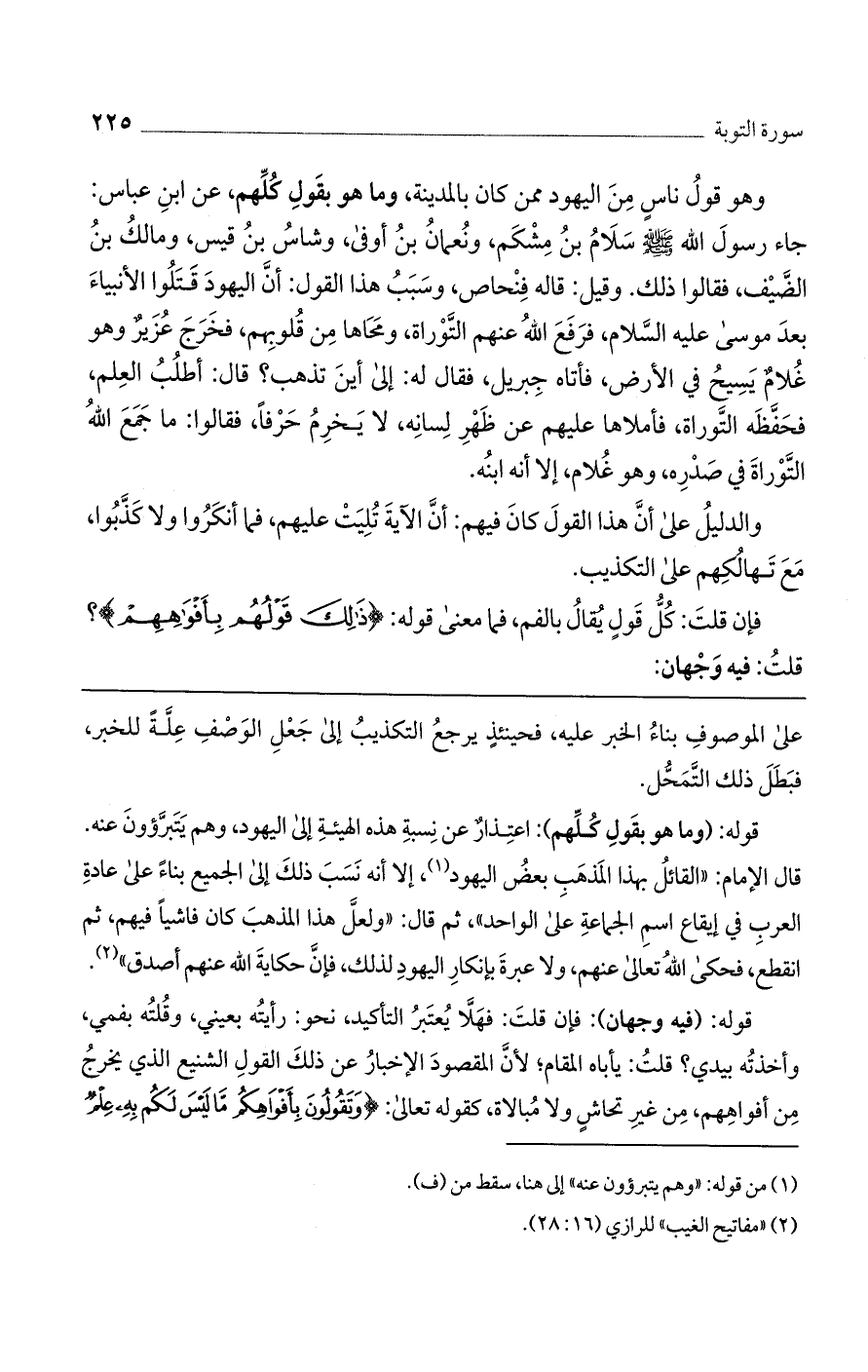 قوله: (وما هو بقول كلهم): اعتذار عن نسبة هذه الهيئة إلى اليهود، وهم يتبرؤون عنه. قال الإمام: "القائل بهذا المذهب بعض اليهود، إلا أنه نسب ذلك إلى الجميع بناء على عادة العرب في إيقاع اسم الجماعة على الواحد"، ثم قال: "ولعل هذا المذهب كان فاشياً فيهم، ثم انقطع، فحكى الله تعالى عنهم، ولا عبرة بإنكار اليهود لذلك، فإن حكاية الله عنهم أصدق".