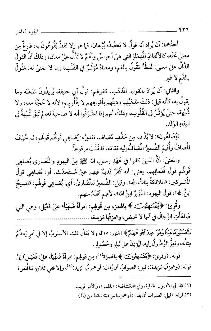 قوله: (وقرئ: (يُضَاهِئُونَ) بالهمزة، من قولهم: امرأة ضهيأ، على: فعيل) إلى قوله: (وهمزتها مزيدة): قيل: الصواب أن يُقال: أو همزتها مزيدة، وإلا ففي كلامه تناقض؛