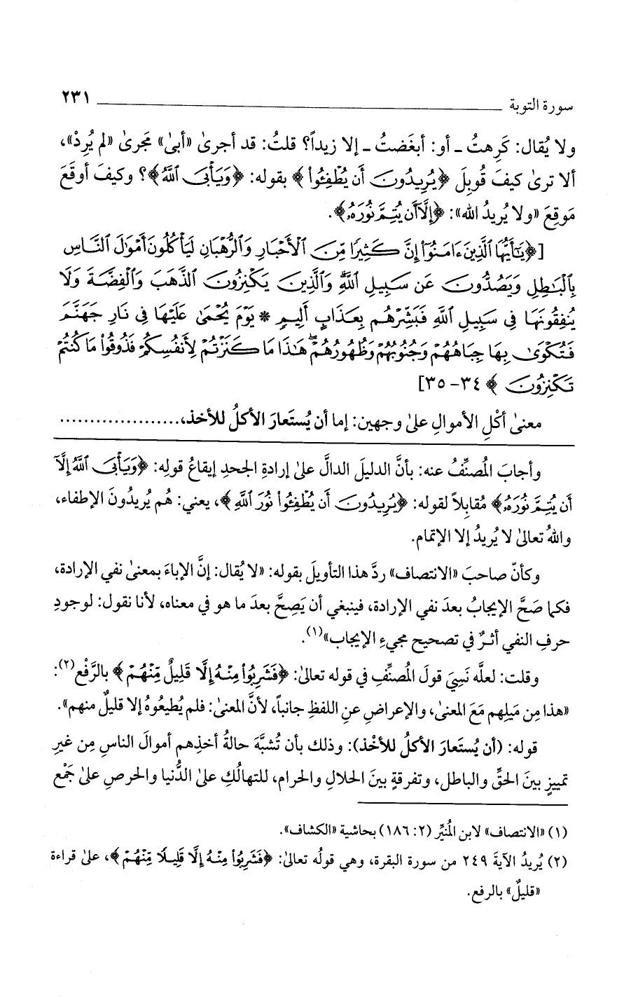 ولا يقال: كرهت -أو: أبغضت- إلا زيداً؟ قلت: قد أجرى "أبى" مجرى "لم يرد"، ألا ترى كيف قوبل (يُرِيدُونَ أَنْ يُطْفِؤُا) بقوله: (وَيَابَى اللَّهُ) وكيف أوقع موقع "ولا يريد الله": (إلاَّ أَن يُتِمَّ نُورَهُ).