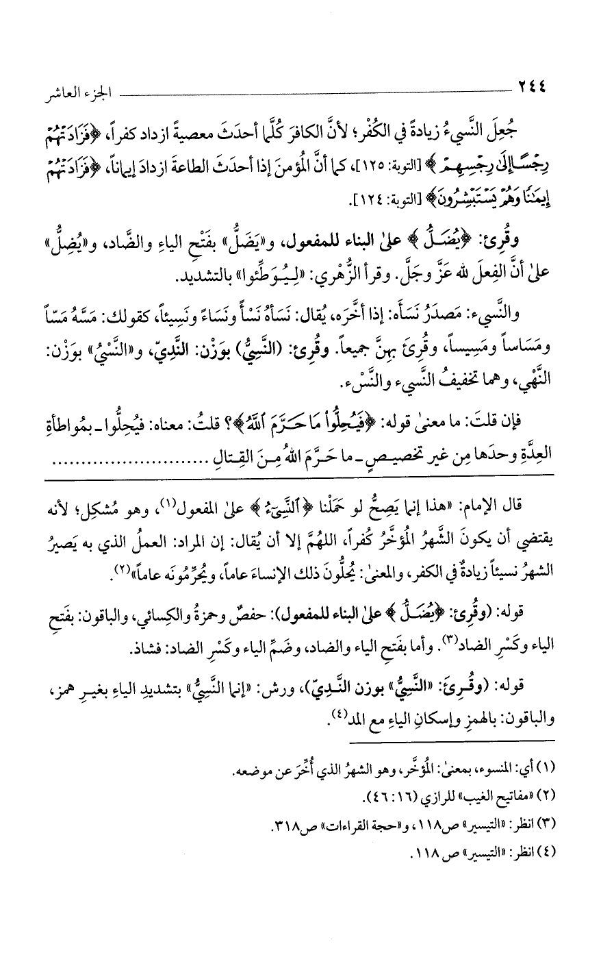 قال الإمام: "هذا إنما يصح لو حملنا (النَّسِيءُ) على المفعول، وهو مُشكل، لأنه يقتضي أن يكون الشهر المؤخر كفراً، اللهم إلا أن يقال: إن المراد: العمل الذي به يصير الشهر نسيئاً زيادة في الكفر، والمعنى: يحلون ذلك الإنساء عاماً، ويحرمونه عاماً".