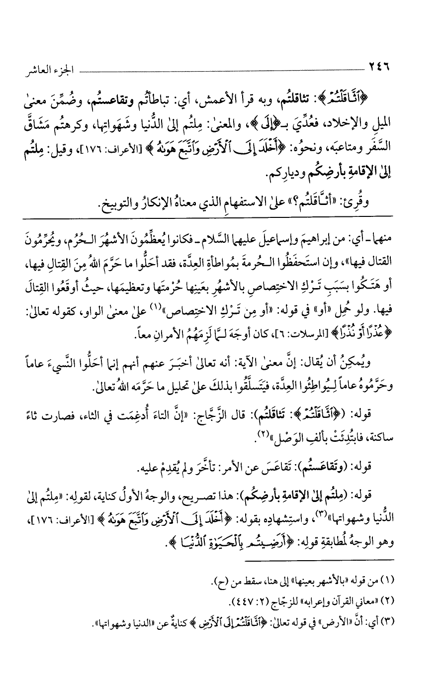 قوله: (ملتم إلى الإقامة بأرضكم): هذا تصريح، والوجه الأول كناية، لقوله: "ملتم إلى الدنيا وشهواتها"، واستشهاده بقوله: (أَخْلَدَ إِلَى الأَرْضِ وَاتَّبَعَ هَوَاهُ) [الأعراف: 176]، وهو الوجه لمطابقة قوله: (أَرَضِيتُمْ بِالْحَيَاةِ الدُّنْيَا).