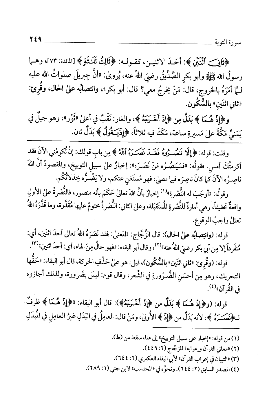 و(إِذْ هُما) بدل من (إذ أخرجه)، والغار: ثقب في أعلى "ثور"، وهو جبل في يمني مكة على مسيرة ساعة، مكثا فيه ثلاثًا، (إِذْ يَقُولُ) بدل ثان.