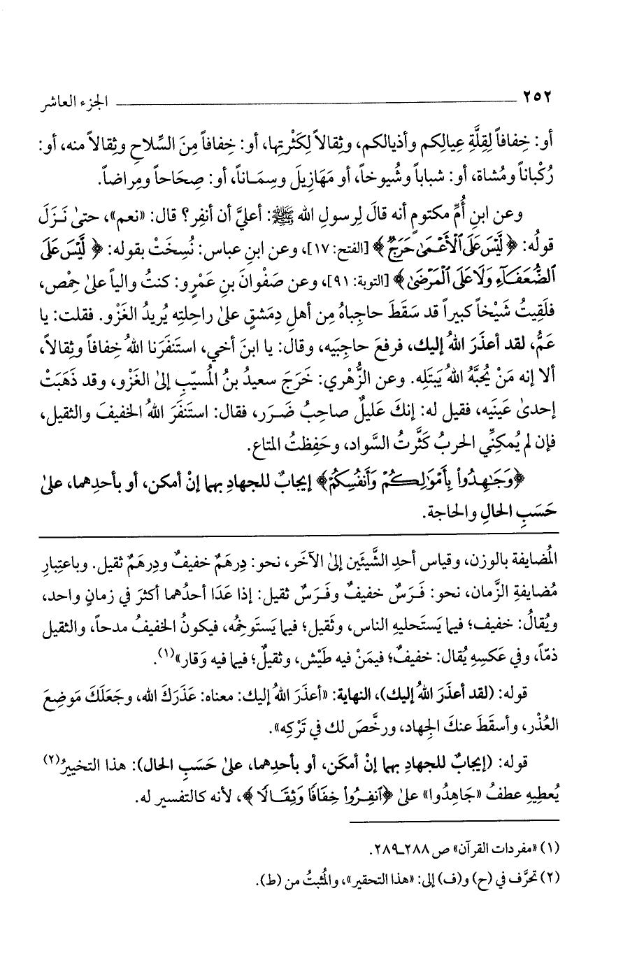 وعن ابن أم مكتوم أنه قال لرسول الله صلى الله عليه وسلم: أعلىّ أن أنفر؟ قال: "نعم"، حتى نزل قوله: (لَيْسَ عَلَى الْأَعْمى حَرَجٌ) [الفتح: 17] وعن ابن عباس: نسخت بقوله: (لَيْسَ عَلَى الضُّعَفاءِ وَلا عَلَى الْمَرْضى) [التوبة: 91]، وعن صفوان بن عمرو: كنت والياً على حمص، فلقيت شيخاً كبيراً قد سقط حاجباه من أهل دمشق على راحلته يريد الغزو. فقلت: يا عمّ، لقد أعذر الله إليك، فرفع حاجبيه وقال: يا بن أخي، استنفرنا الله خفافا وثقالا، إلا أنه من يحبه الله يبتله. وعن الزهري: خرج سعيد بن المسيب إلى الغزو، وقد ذهبت إحدى عينيه، فقيل له: إنك عليل صاحب ضرر، فقال: استنفرنا الله الخفيف والثقيل، فإن لم يمكني الحرب كثرت السواد وحفظت المتاع.