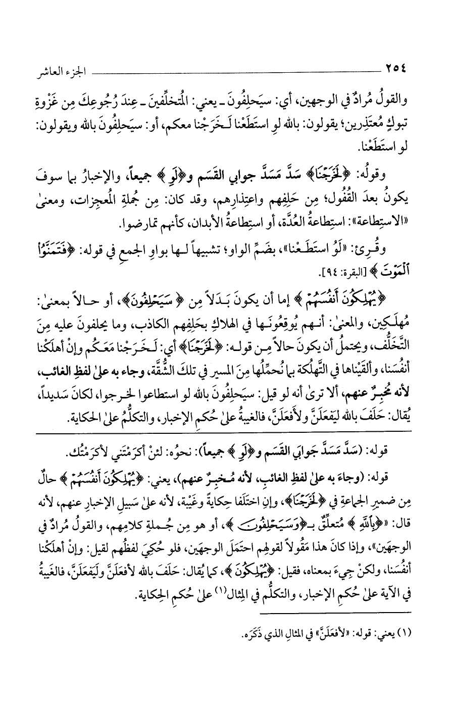 قوله: (وجاء به على لفظ الغائب، لأنه مخبر عنهم)، يعني: (يُهْلِكُونَ أَنفُسَهُمْ) حال من ضمير الجماعة في (لَخَرَجْنَا)، وإن اختلفا حكاية وغيبة، لأنه على سبيل الإخبار عنهم، لأنه قال: " (بِاللَّهِ) متعلق بـ (وَسَيَحْلِفُونَ)، أو هو من جملة كلامهم، والقول مراد في الوجهين"، وإذا كان هذا مقولاً لقولهم احتمل الوجهين، فلو حُكي لفظهم لقيل: وإن أهلكنا أنفسنا، ولكن جيء بمعناه، فقيل: (يُهْلِكُونَ)، كما يقال: حلف بالله لأفعلن وليفعلن، فالغيبة في الآية على حكم الإخبار، والتكلم في المثال على حكم الحكاية.