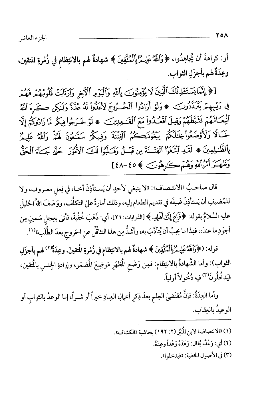 قوله: ((وَاللَّهُ عَلِيمٌ بِالْمُتَّقِينَ) شهادة لهم بالانتقام في زمرة المتقين، وعدة لهم بأجزل الثواب): وأما الشهادة بالانتظام: فمن وضع المظهر موضع المضمر، وإرادة الجنس بالمتقين، فيدخلون فيه دخولاً أولياً.