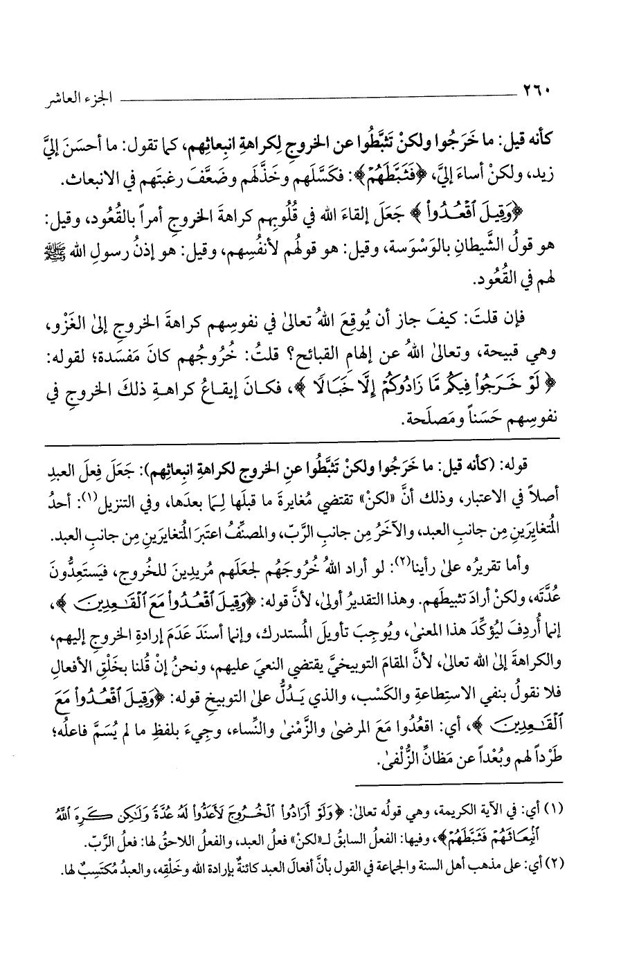 وأما تقريره على رأينا: لو أراد الله خروجهم لعلهم مريدين للخروج، فيستعدون عدته، ولكن أراد تثبيطهم. وهذا التقدير أولى، لأنه قوله: (وَقِيلَ اقْعُدُوا مَعَ الْقَاعِدِينَ)، إنما أُردف ليؤكد هذا المعنى، ويُوجب تأويل المستدرك، وإنما أسند عدم إرادة الخروج إليهم، الكراهة إلى الله تعالى، لأن المقام التوبيخي يقتضي النعي عليهم، ونحن إن قلنا بخلق الأفعال فلا نقول بنفي الاستطاعة الكسب، والذي يدل على التوبيخ قوله: (وَقِيلَ اقْعُدُوا مَعَ الْقَاعِدِينَ)، أي: اقعدوا مع المرضى والزمنى والنساء، وجيء بلفظ ما لم يسم فاعله؛ طرداً لهم وبُعداً عن مظان الزلفى.