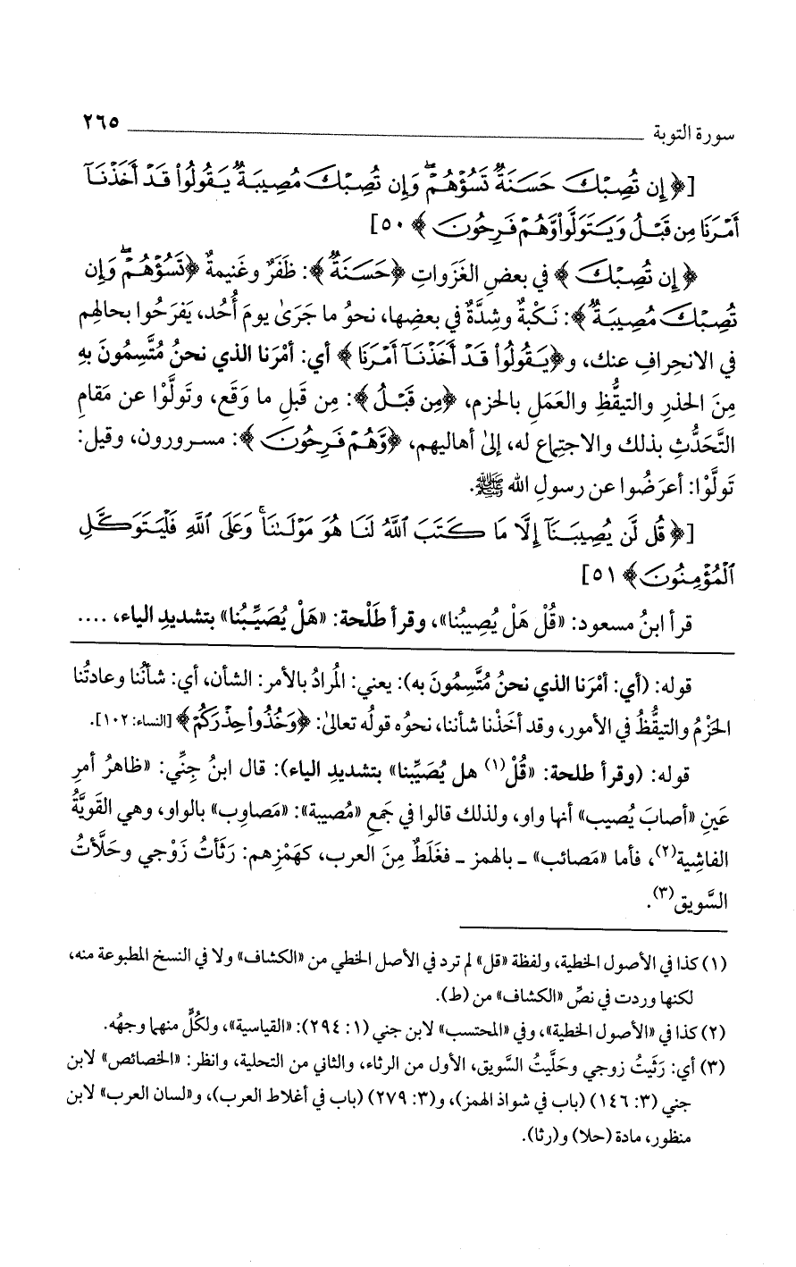 قرأ ابن مسعود: "قل هل يصيبنا"، وقرأ طلحة: "هل يصيبنا"، بتشديد الياء، ......