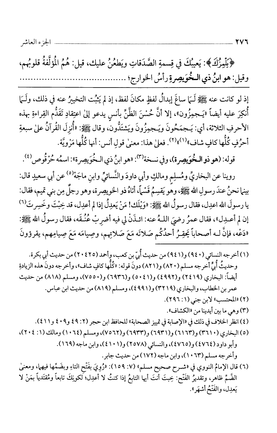 روينا عن البخاري ومسلم ومالك وأبي داود والنسائي وابن ماجه عن أبي سعيد قال: بينما نحن عند رسول الله صلى الله عليه وسلم، هو يقسم قسماً، أتاه ذو الخويصرة، وهو رجل من بني تميم، فقال: يا رسول الله اعدل، فقال رسول الله صلى الله عليه وسلم: "ويلك! من يعدل إذا لم أعدل، قد خبت وخسرت إن لم أعدل"، فقال عمر رضي الله عنه: ائذن لي فيه أضرب عنقه، فقال رسول الله صلى الله عليه وسلم: "دعه، فإن له أصحاباً يحقر أحدكم صلاته مع صلاتهم، وصيامه مع صيامهم، يقرؤون