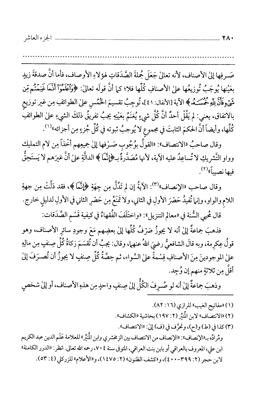 وقال صاحب "الانتصاف": "القول بوجوب صرفها إلى جميعهم أخذاً من لام التمليك وواو التشريك لا تساعد عليه الآية، لأنها مصدرة بـ (إنَّمَا) الدالة على أن غيرهم لايستحق فيها نصيباً".