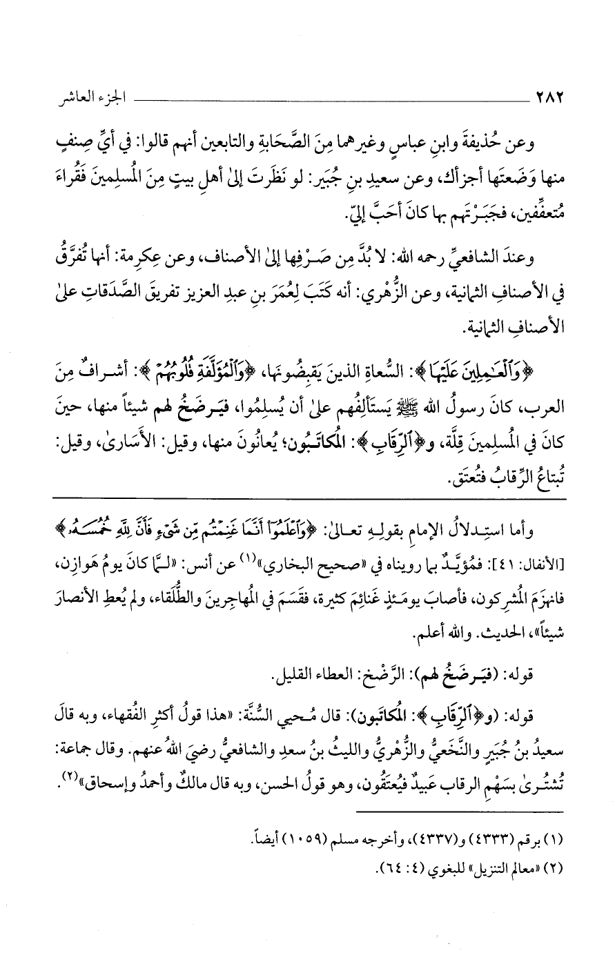 قوله: (و (الرِّقَابِ): المكاتبون): قال محيي السنة: "هذا قول أكثر الفقهاء، وبه قال سعيد بن جبير والنخعي والزهري والليث بن سعد والشافعي رضي الله عنهم. وقال جماعة: تُشترى بسهم الرقاب عبيد فيعتقون، وهو قول الحسن، وبه قال مالك وأحمد وإسحاق".