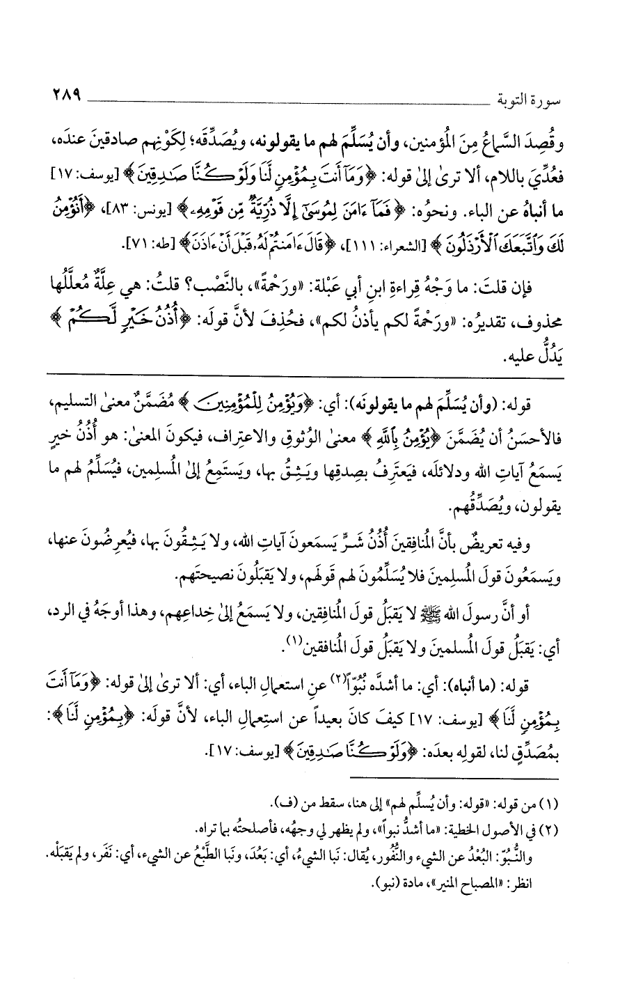 قوله: (وأن يسلم لهم ما يقولونه): أي: (وَيُؤْمِنُ لِلْمُؤْمِنِينَ) مضمن معنى التسليم، فالأحسن أن يُضمن (يُؤْمِنُ بِاللَّهِ) معنى الوثوق والاعتراف، فيكون المعنى: هو أذن خير يسمع آيات الله ودلائله، فيعترف بصدقها ويشق بها، ويستمع إلى المسلمين، فيسلم لهم ما يقولون، ويصدقهم.