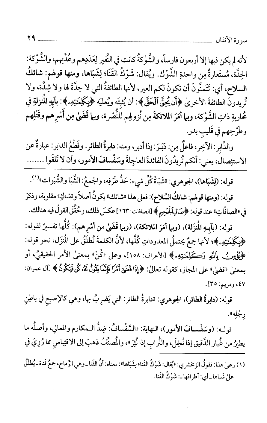 لأنه لم يكن فيها إلا أربعون فارسًا، والشوكة كانت في النفير لعددهم وعدّتهم، والشوكة: الحدّة، مستعارة من واحدة الشوك. ويقال: شوك القنا؛ لشباها، ومنها قولهم: شائك السلاح، أي تتمنون أن تكون لكم العير، لأنها الطائفة التي لا حدّة لها ولا شدّة، ولا تريدون الطائفة الأخرى (أَنْ يُحِقَّ الْحَقَّ): أن يثبته ويعليه (بِكَلِمتِهِ): بآيه المنزلة في محاربة ذات الشوكة، وبما أمر الملائكة من نزولهم للنصرة، وبما قضى من أسرهم وقتلهم وطرحهم في قليب بدر.