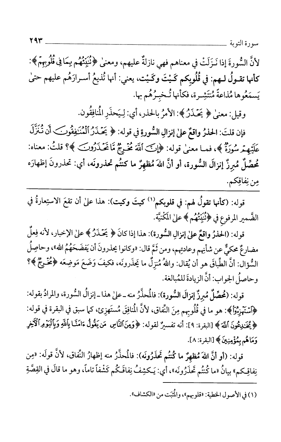 فإن قلت: الحذر واقع على إنزال السورة في قوله: (يَحْذَرُ الْمُنافِقُونَ أَنْ تُنَزَّلَ عَلَيْهِمْ سُورَةٌ)، فما معنى قوله (إن الله مُخْرِجٌ ما تَحْذَرُونَ)؟ قلت: معناه: محصل مبرز إنزال السورة. أو أنّ الله مظهر ما كنتم تحذرونه، أي تحذرون إظهاره من نفاقكم.