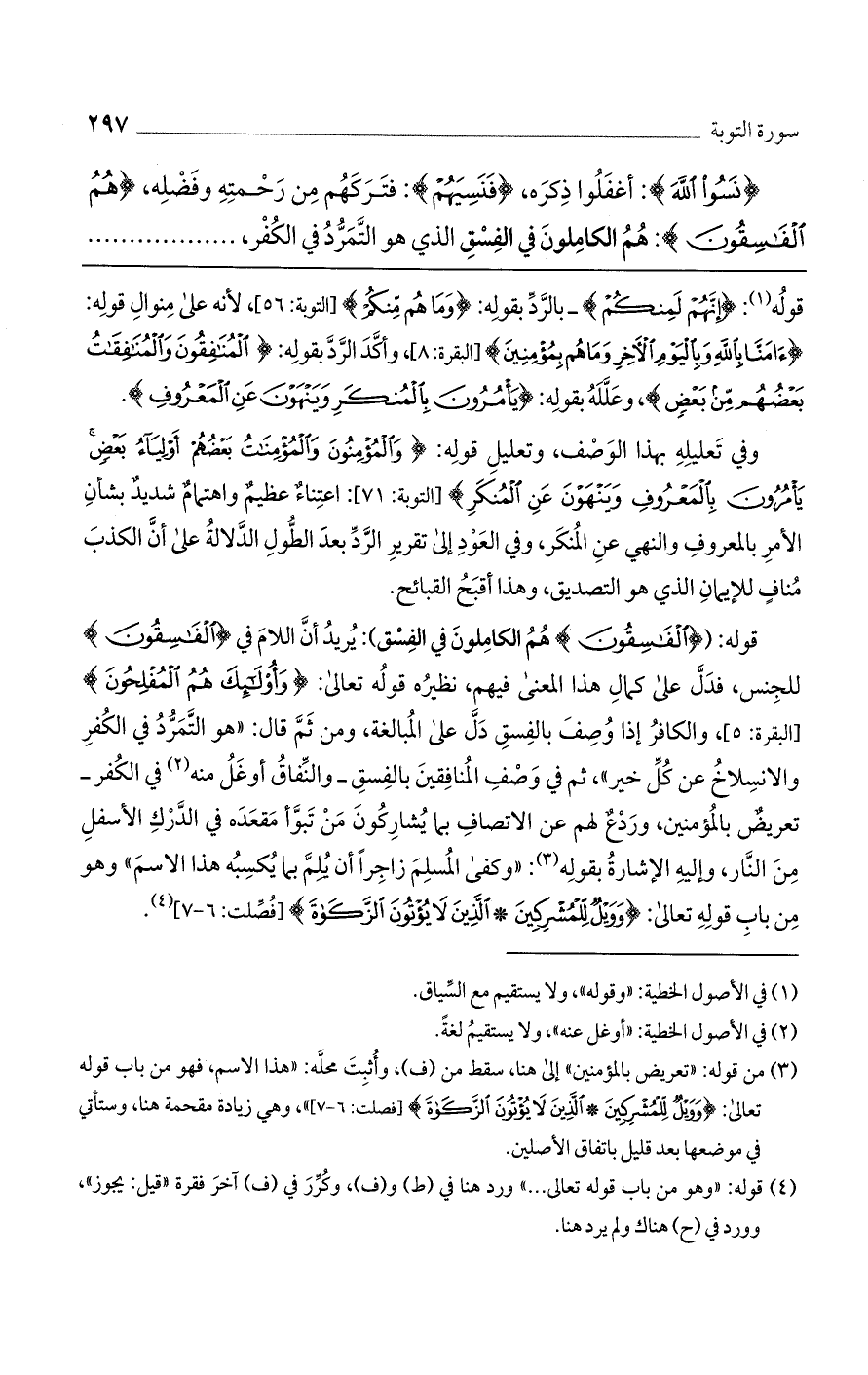 قوله: ((الْفَاسِقُونَ) هم الكاملون في الفسق): يريد أن اللام في (الْفَاسِقُونَ) للجنس، فدل على كمال هذا المعنى فيهم، نظيره قوله تعالى: (وَأُوْلَئِكَ هُمْ الْمُفْلِحُونَ) [البقرة: 5]، والكافر إذا وُصف بالفسق دل على المبالغة، ومن ثم قال: "هو التمرد في الكفر والانسلاخ عن كل خير"، ثم في وصف المنافقين بالفسق دل على المبالغة، ومن ثم قال: "هو التمرد في الكفر الانسلاخ عن كل خير"، ثم في وصف المنافقين بالفسق - والنفاق أوغل منه في الكفر - تعريض بالمؤمنين، وردع لهم عن الاتصاف بما يشاركون من تبوأ مقعده في الدرك الأسفل من النار، وإليه الإشارة بقوله: "وكفى المسلم زاجراً أن يُلم بما يكسبه هذا الاسم" وهو من باب قوله تعالى: (وَوَيْلٌ لِلْمُشْرِكِينَ * الَّذِينَ لا يُؤْتُونَ الزَّكَاةَ) [فصلت: 6 - 7].