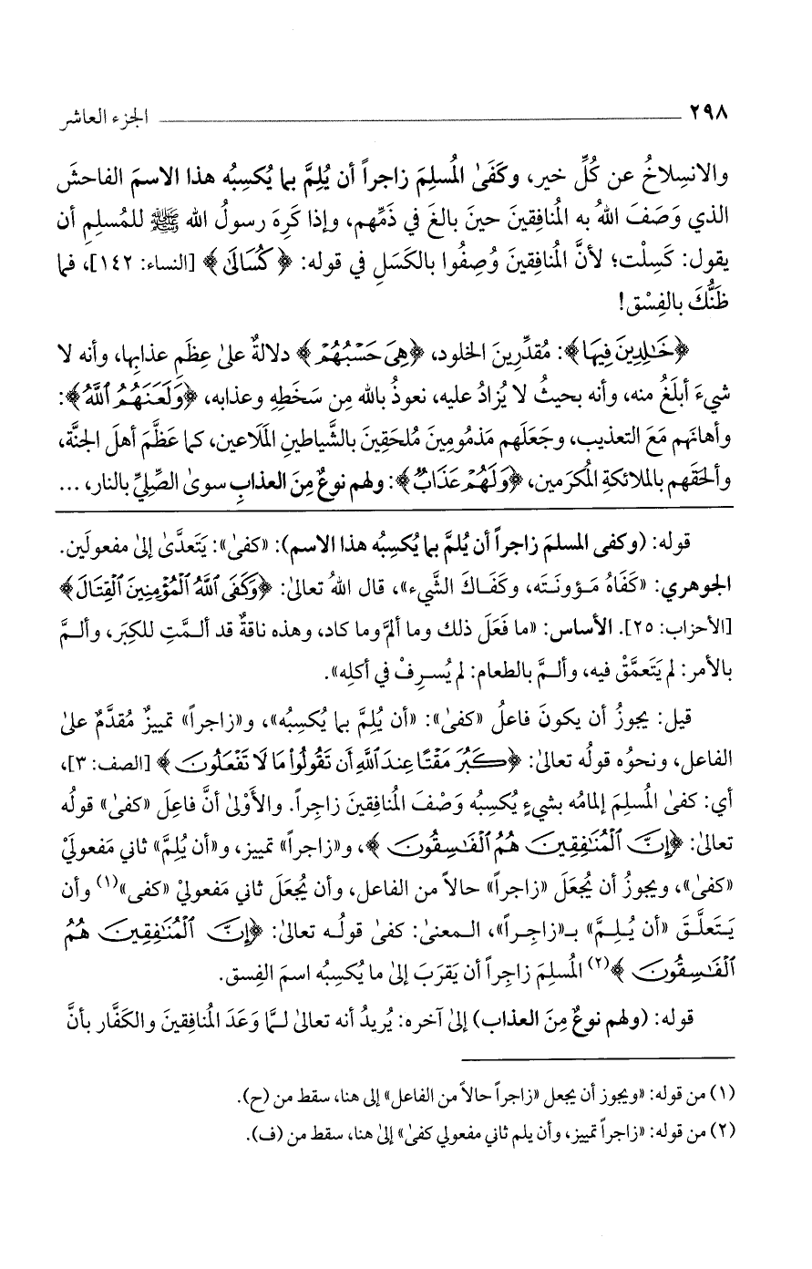 قيل: يجوز أن يكون فاعل "كفى": "أن يُلم بما يكسبه"، و"زاجراً" تمييز مقدم على الفاعل، ونحوه قوله تعالى: (كَبُرَ مَقْتاً عِنْدَ اللَّهِ أَنْ تَقُولُوا مَا لا تَفْعَلُونَ) [الصف: 3]، أي: كفى المسلم إلمامه بشيء يكسبه وصف المنافين زاجراً. والأولى أن فاعل "كفى" قوله تعالى: (إِنَّ الْمُنَافِقِينَ هُمْ الْفَاسِقُونَ)، و"زاجراً" تمييز، و"أن يُلم" ثاني مفعولي "كفى"، ويجوز أن يُجعل "زاجراً" حالاً من الفاعل، وأن يُجعل ثاني مفعولي "كفى" وأن يتعلق "أن يُلم" بـ "زاجراً"، المعنى: كفى قوله تعالى: (إِنَّ الْمُنَافِقِينَ هُمْ الْفَاسِقُونَ) المسلم زاجراً أن يقرب إلى ما يكسبه اسم الفسق.