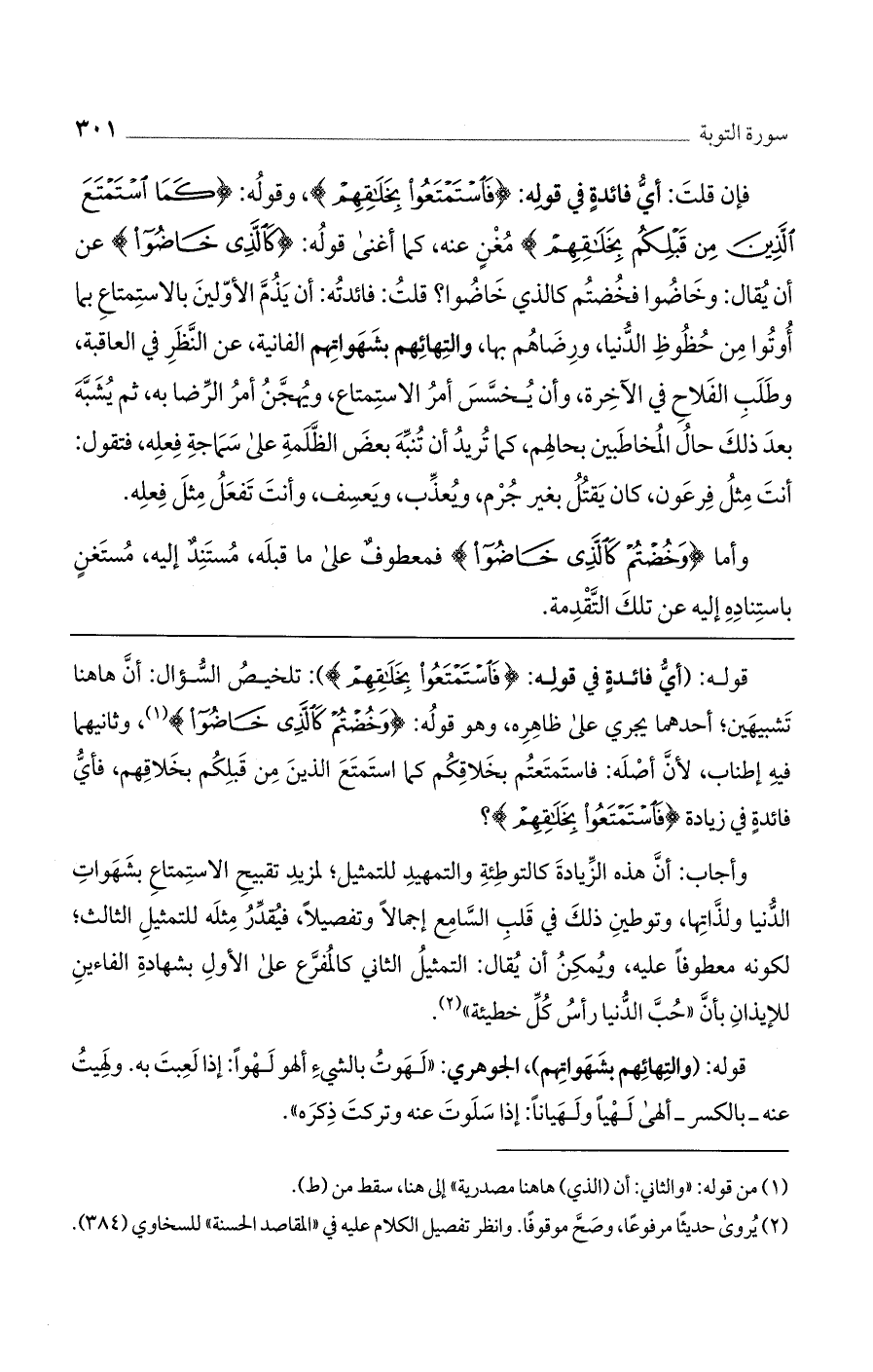 قوله: (أي فائدة في قوله: (فَاسْتَمْتَعُوا بِخَلاقِهِمْ): تلخيص السؤال: أن هاهنا تشبيهين؛ أحدهما يجري على ظاهره، وهو قوله: (وَخُضْتُمْ كَالَّذِي خَاضُوا)، وثانيهما فيه إطناب، لأن أصله فاستمتعتم بخلاقكم كما استمتع الذين من قبلكم بخلاقهم، فأي فائدة في زيادة (فَاسْتَمْتَعُوا بِخَلاقِهِمْ)؟