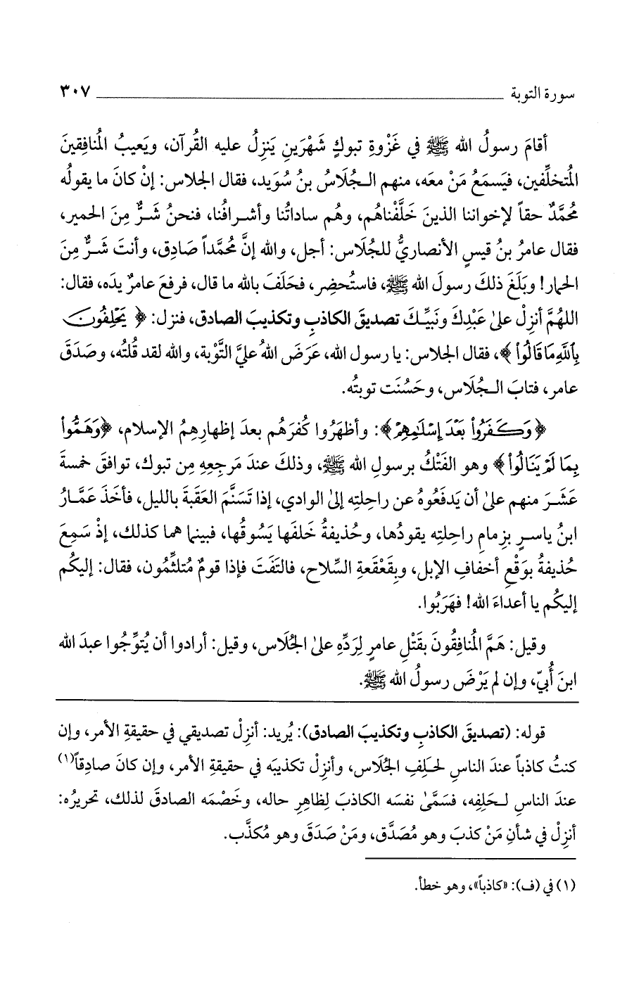 أقام رسول الله صلى الله عليه وسلم في غزوة تبوك شهرين ينزل عليه القرآن، ويعيب المنافقين المتخلفين فيسمع من معه منهم، منهم الجلاس بن سويد، فقال الجلاس: إن كان ما يقول محمد حقاً لإخواننا الذين خلفناهم، وهم ساداتنا وأشرافنا، فنحن شر من الحمير، فقال عامر بن قيس الأنصاري للجلاس: أجل، والله إنّ محمداً صادق، وأنت شرّ من الحمار! وبلغ ذلك رسول الله صلى الله عليه وسلم، فاستحضر فحلف بالله ما قال، فرفع عامر يده، فقال: اللهم أنزل على عبدك ونبيك تصديق الكاذب وتكذيب الصادق، فنزل: (يَحْلِفُونَ بِاللَّهِ ما قالُوا) فقال الجلاس: يا رسول الله، عرض الله علىّ التوبة، والله لقد قلته، وصدق عامر، فتاب الجلاس وحسنت توبته.