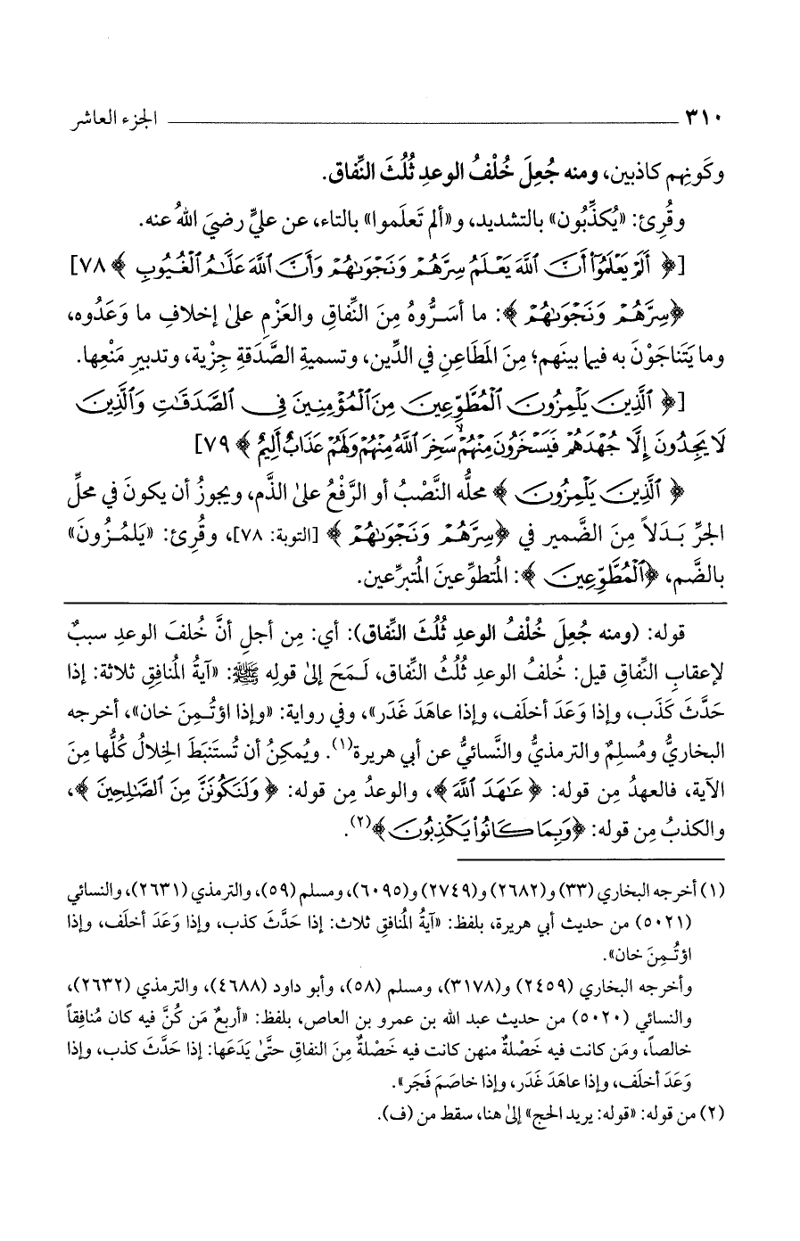 قوله: (ومنه جُعل خُلفُ الوعدِ ثلث النفاق): أي: من أجل أن خُلفَ الوعد سببٌ لإعقاب النفاق قبل: خُلفُ الوعد ثلث النفاق، لمح إلى قوله صلى الله عليه وسلم: "آية المنافق ثلاثة: إذا حدث كذب، وإذا وعد أخلف، وإذا عاهد غدر"، وفي رواية: "وإذا اؤتمن خان"، أخرجه البخاري ومسلم والترمذي والنسائي عن أبي هريرة. ويمكن أن تستنبط الخلال كلها من الآية، فالعهد من قوله: (عَاهَدَ اللَّهَ)، والوعد من قوله: (وَلَنَكُونَنَّ مِنْ الصَّالِحِينَ)، والكذب من قوله: (وَبِمَا كَانُوا يَكْذِبُونَ).