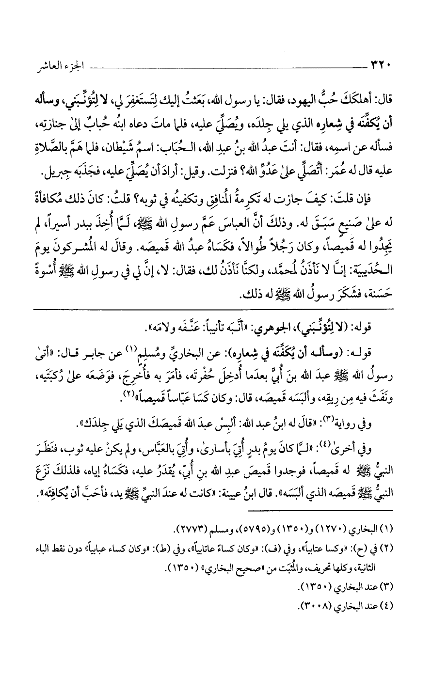 قوله: (وسأله أن يكفنه في شعاره): عن البخاري ومسلم عن جابر قال: "أتى رسول الله صلى الله عليه وسلم عبد الله بن أُبيٍّ بعدما أُدخل حفرته، فأمر به فأخرج، فوضعه على ركبتيه، ونفث فيه من ريقه، وألبسه قميصه، قال: وان كسا عباساً قميصاً".
