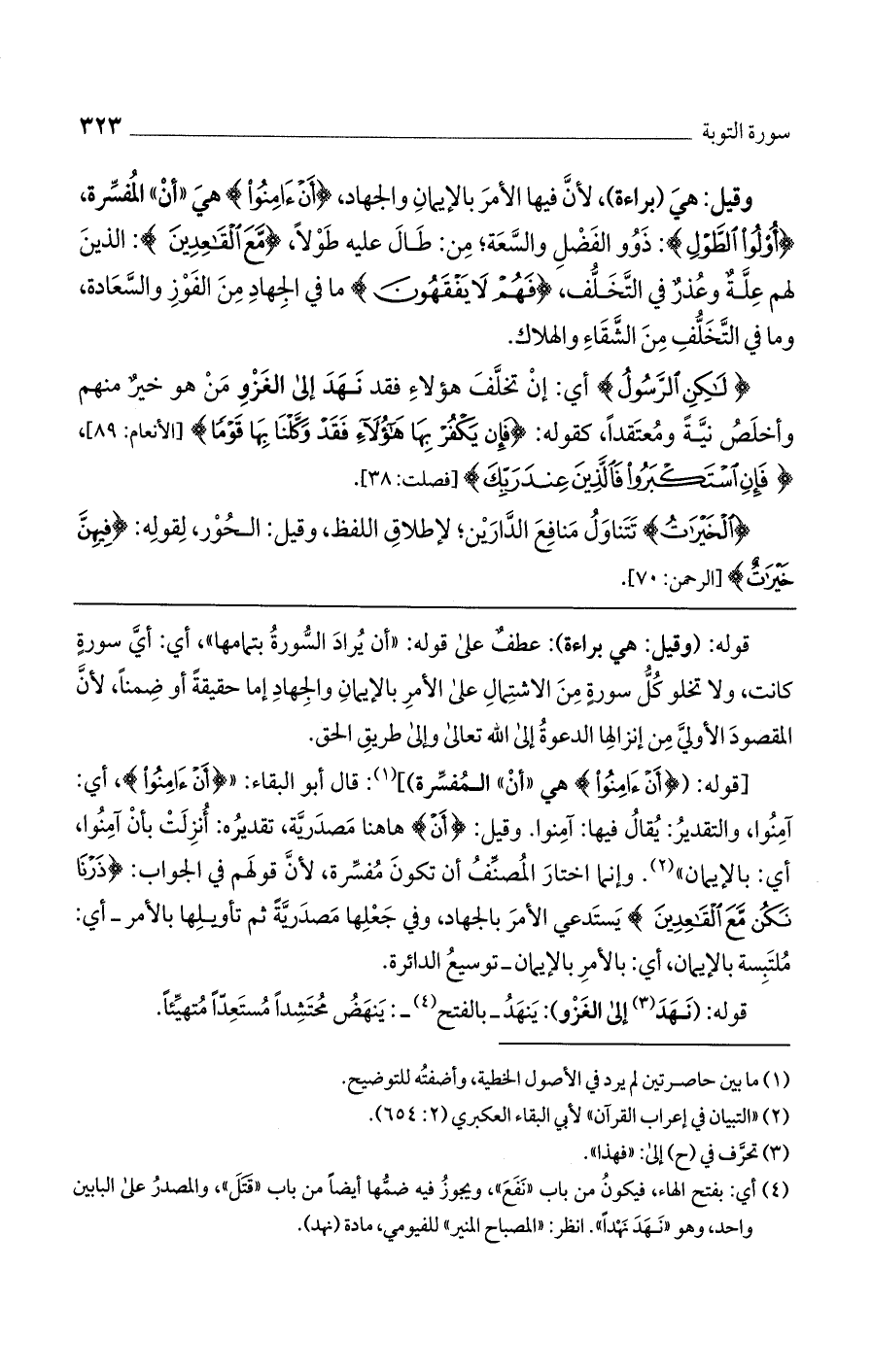 وقيل: هي (براءة)، لأنّ فيها الأمر بالإيمان والجهاد، (أَنْ آمِنُوا) هي" أن" المفسرة، (أُولُوا الطَّوْلِ): ذوو الفضل والسعة، من: طال عليه طولا، (مَعَ الْقاعِدِينَ): مع الذين لهم علة وعذر في التخلف، (فَهُمْ لا يَفْقَهُونَ) ما في الجهاد من الفوز والسعادة، وما في التخلف من الشقاء والهلاك.