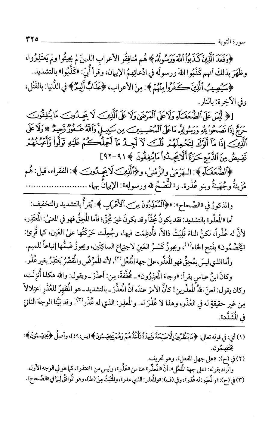 وأما الذي ليس بمحق فهو المُعذر، على جهة المفعل، لأنه الممرض والمقصر يعتر بغير عذر. وكان ابن عباس يقرأ: "وجاء المعذرون" - مخففة، من: أعذر - ويقول: والله هذا أُنزلت، وكان يقول: لعن الله المعذرين! كأن الأمر عنده أن المعذر - بالتشديد - هو المظهر للعذر اعتلالاً من غير حقيقة له في العذر، وهذا لا عذر له. والمعذر: الذي له عُذر. وقد بينا الوجه الثاني في المُشدد".