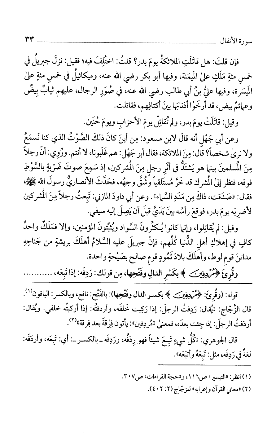 قوله: (وقرئ: (مُرْدِفِينَ) بكسر الدال وفتحها): بالفتح: نافع، وبالكسر: الباقون. قال الزجاج: "يُقال: ردفت الرجل: إذا ركبت خلفه، وأردفته: إذا أركبته خلفي. ويُقال: أردفت الرجل: إذا جئت بعده، فمعنى "مردفين": يأتون فرقة بعد فرقة".