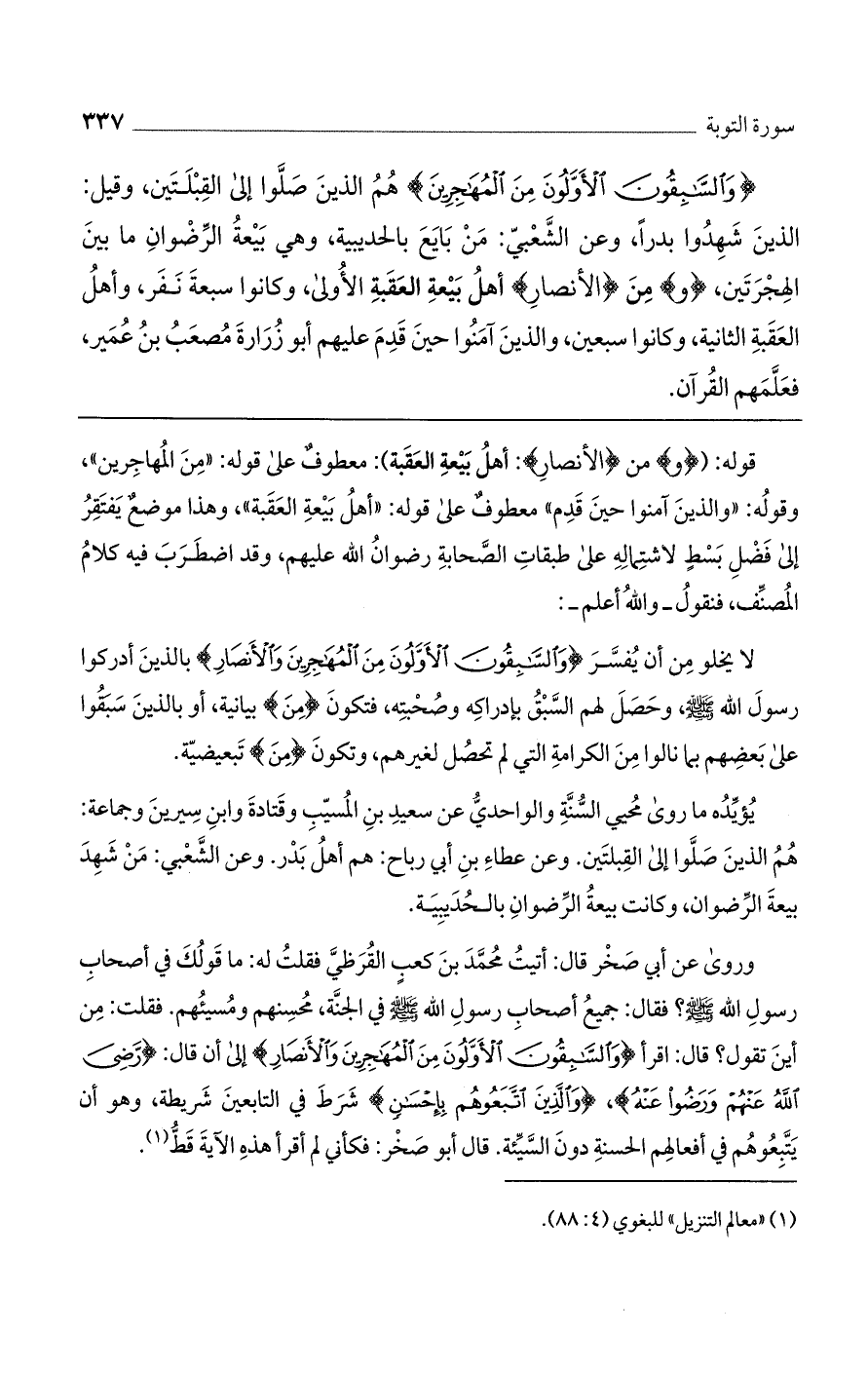 لا يخلو من أن يفسر (وَالسَّابِقُونَ الأَوَّلُونَ مِنْ الْمُهَاجِرِينَ وَالأَنصَارِ) بالذين أدركوا رسول الله صلى الله عليه وسلم، وحصل لهم السبق بإدراكه وصحبته، فتكون (مِنَ) بيانية، أو بالذين سبقوا على بعضهم بما نالوا من الكرامة التي لم تحصل لغيرهم، وتكون (مِنَ) تبعيضية.
