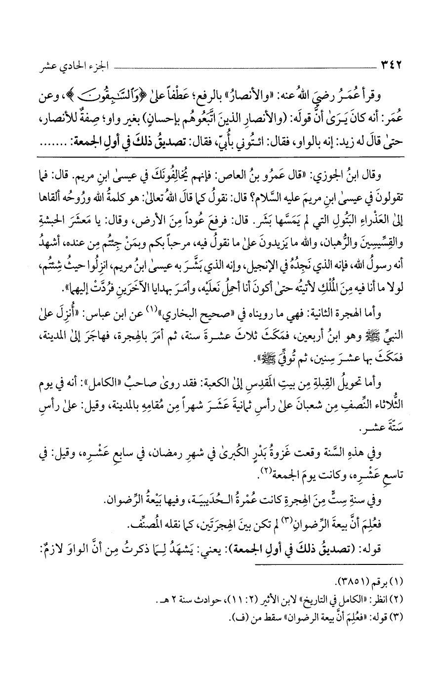 وقرأ عمر رضي الله عنه: "والأنصار" بالرفع؛ عطفا على (السابقون)، وعن عمر: أنه كان يرى أنّ قوله: (والأنصار وَالَّذِينَ اتَّبَعُوهُمْ بِإِحْسانٍ) بغير واو، صفة للأنصار، حتى قال له زيد: إنه بالواو، فقال: ائتوني بأبي، فقال: تصديق ذلك في أول الجمعة: