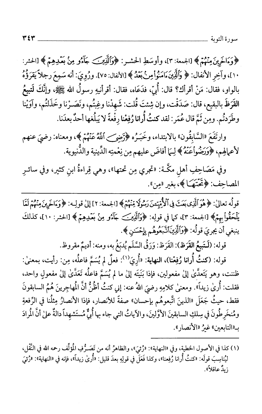 قوله: (كنت أرانا رُفعنا)، النهاية: "أُرى: فعلٌ لم يسم فاعله، من: رأيت، بمعنى: ظننت، وهو يتعدى إلى مفعولين، فإذا بنيته إلى ما لم يسم فاعله تعدى إلى مفعول واحد، فقلت: أرى زيداً". ومعنى كلامه رضي الله عنه: إني كنت أظن أن المهاجرين هم السابقون فقط، حيث جعل "الذين اتبعوهم بإحسان" صفة للأنصار، فإذا الأنصار مثلنا في الرفعة ومنخرطون في سلك السابقين الأولين، والآيات التي جاء بها أبي مستشهداً دالة على أن المراد بـ "التابعين" غير "الأنصار".